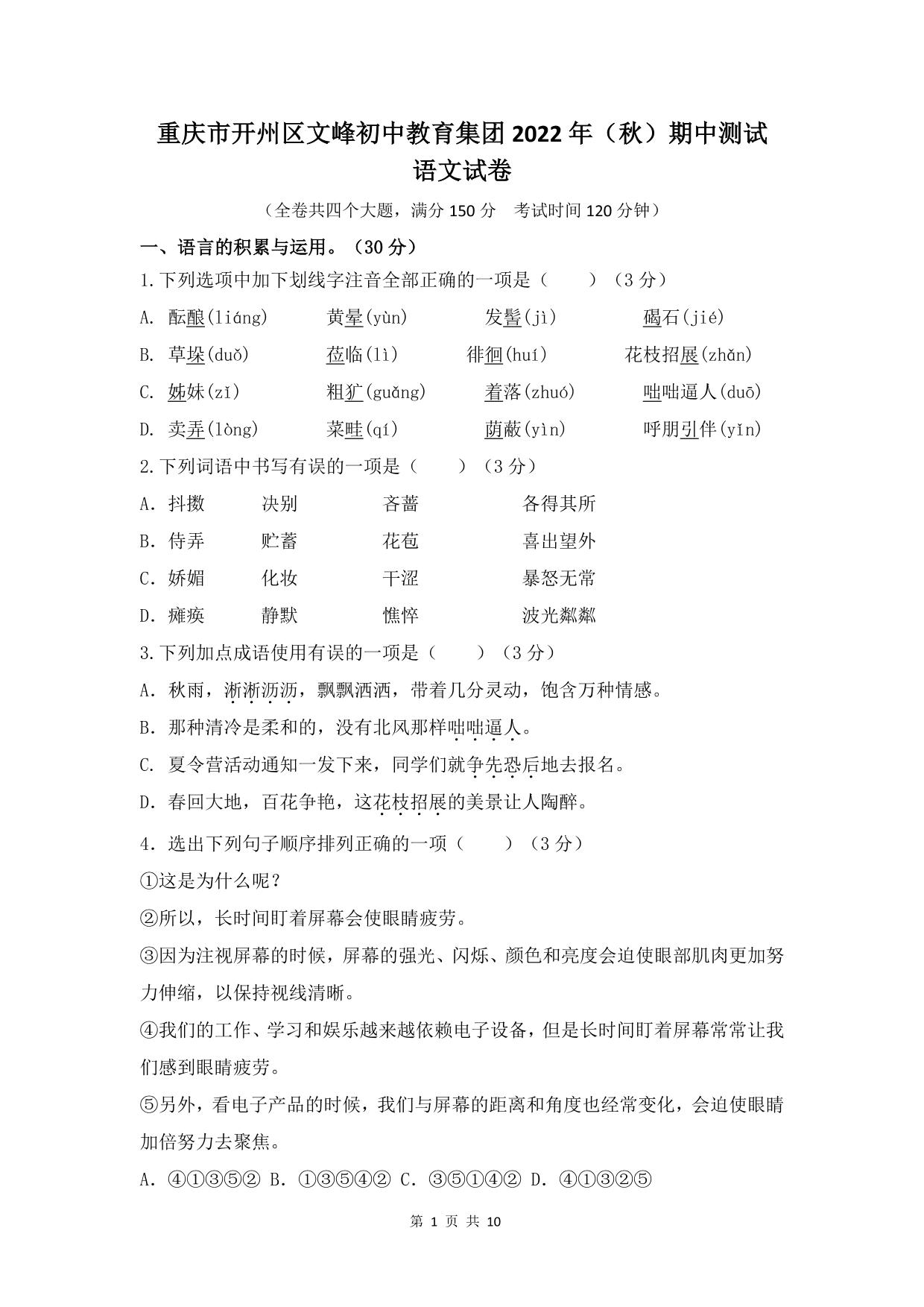 重庆市开州区文峰初中教育集团2022-2023学年七年级上学期期中语文试卷