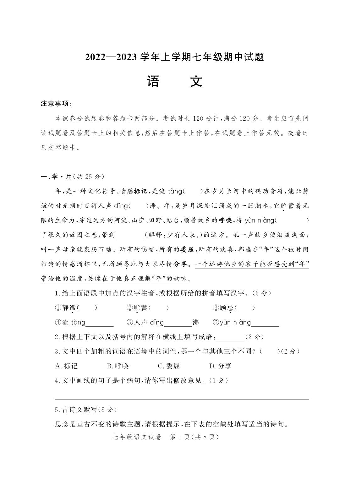 河南省郑州市八十五中2022-2023学年上学期期中考试七年级语文试卷