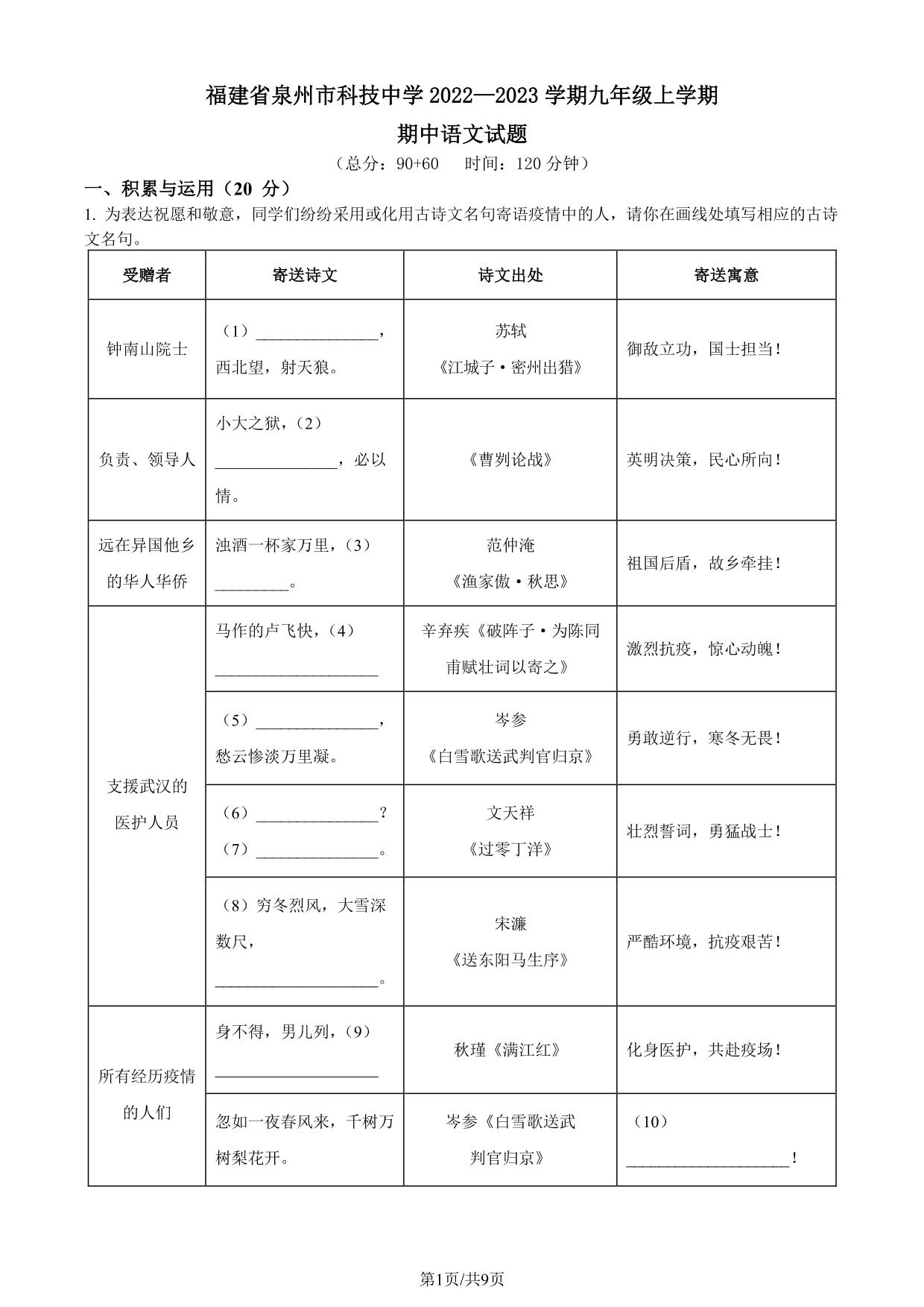 福建省泉州市科技中学2022-2023学年九年级上学期期中语文试题