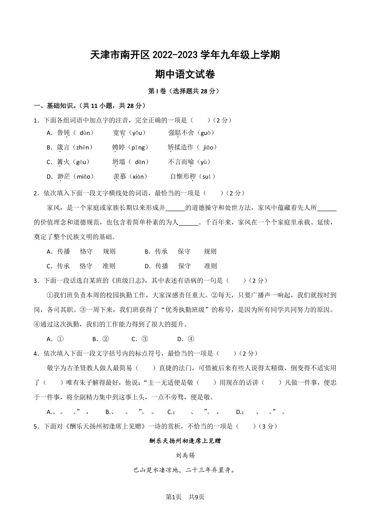 天津市南开区2022-2023学年九年级上学期期中考试语文试卷