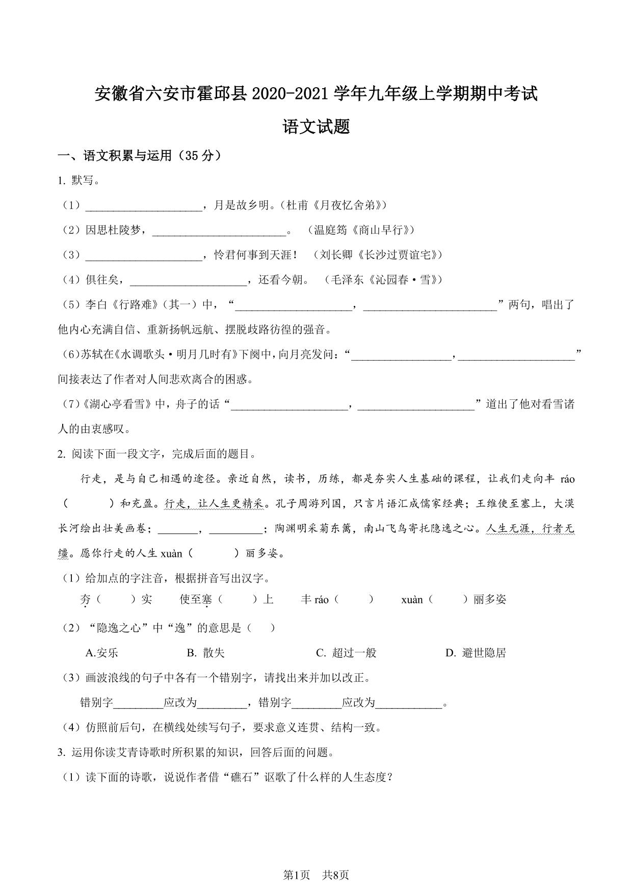 安徽省六安市霍邱县2020-2021学年九年级上学期期中语文试题