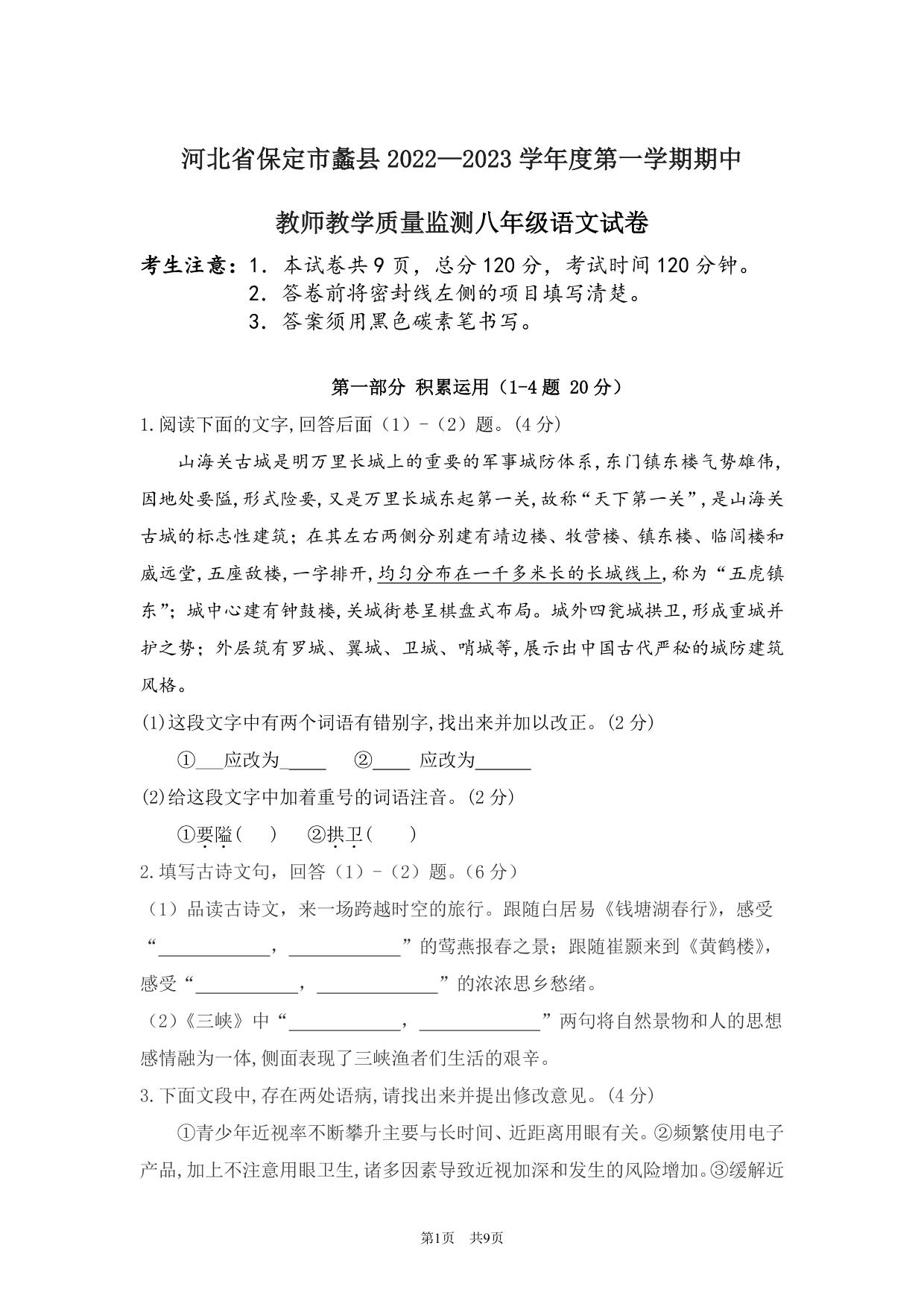 河北省保定市蠡县2022-2023学年八年级上学期期中考试语文试题