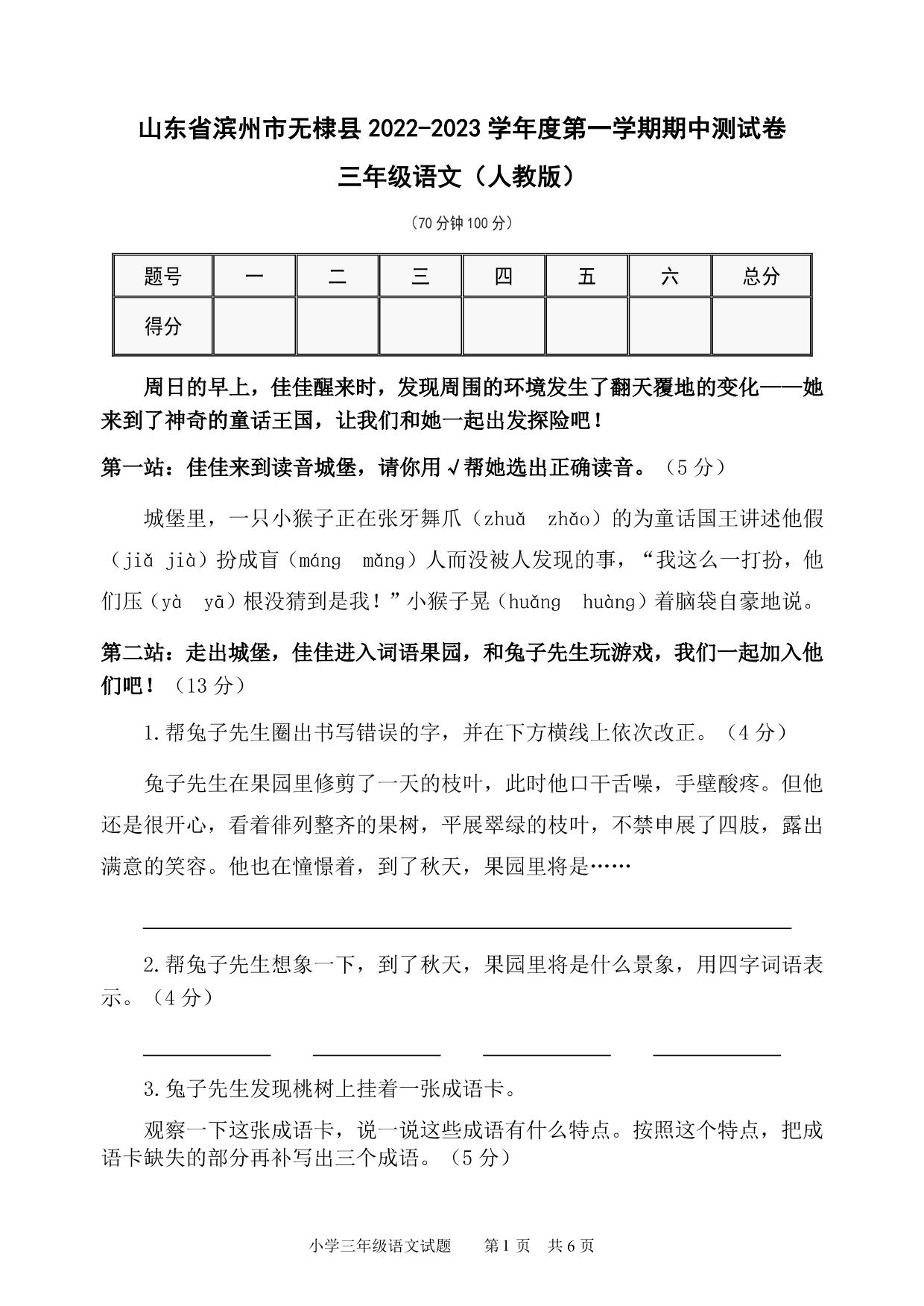 山东省滨州市无棣县2022-2023学年度第一学期期中测试卷三年级语文(人教版)