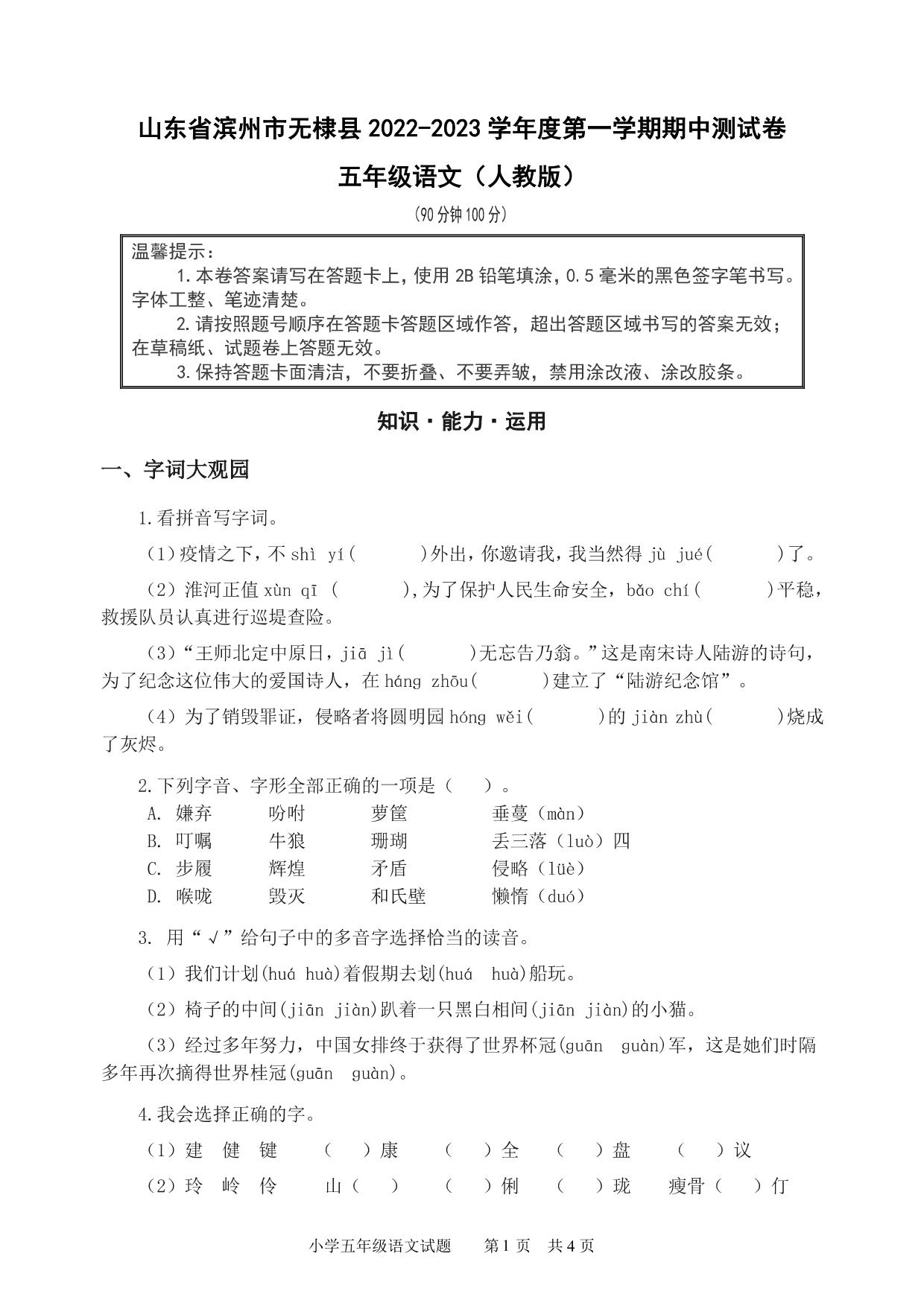 山东省滨州市无棣县2022-2023学年度第一学期期中测试卷五年级语文(人教版)