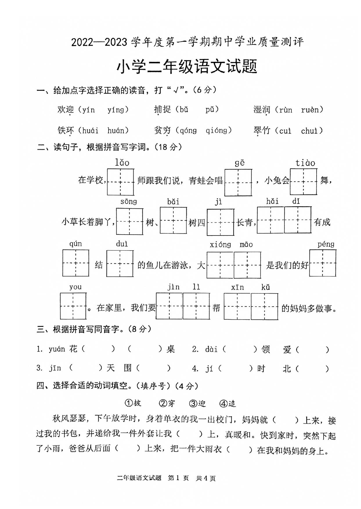 山东省菏泽市成武县2022-2023学年度第一学期期中学业质量测评试题二年级语文(人教版)