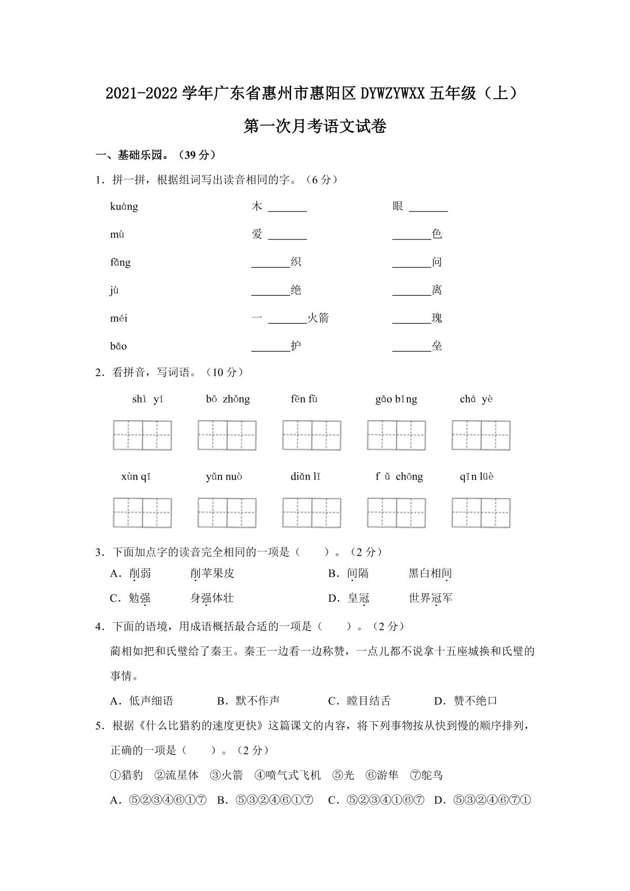 广东省惠州市惠阳区DYWJA ZYW XX2021—2022学年五年级语文上学期第一次月考试卷