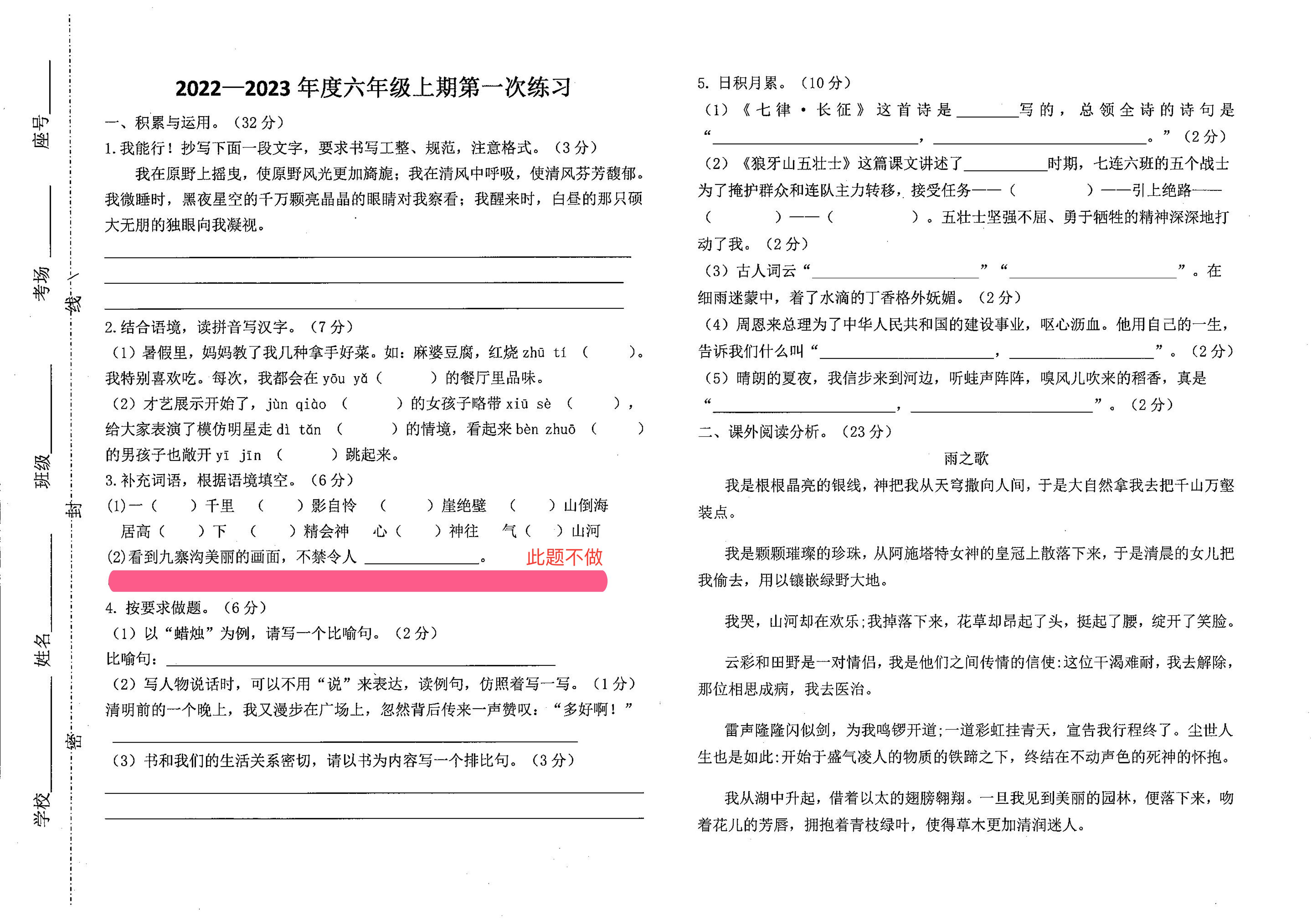 六年级语文人教版上册月考卷
