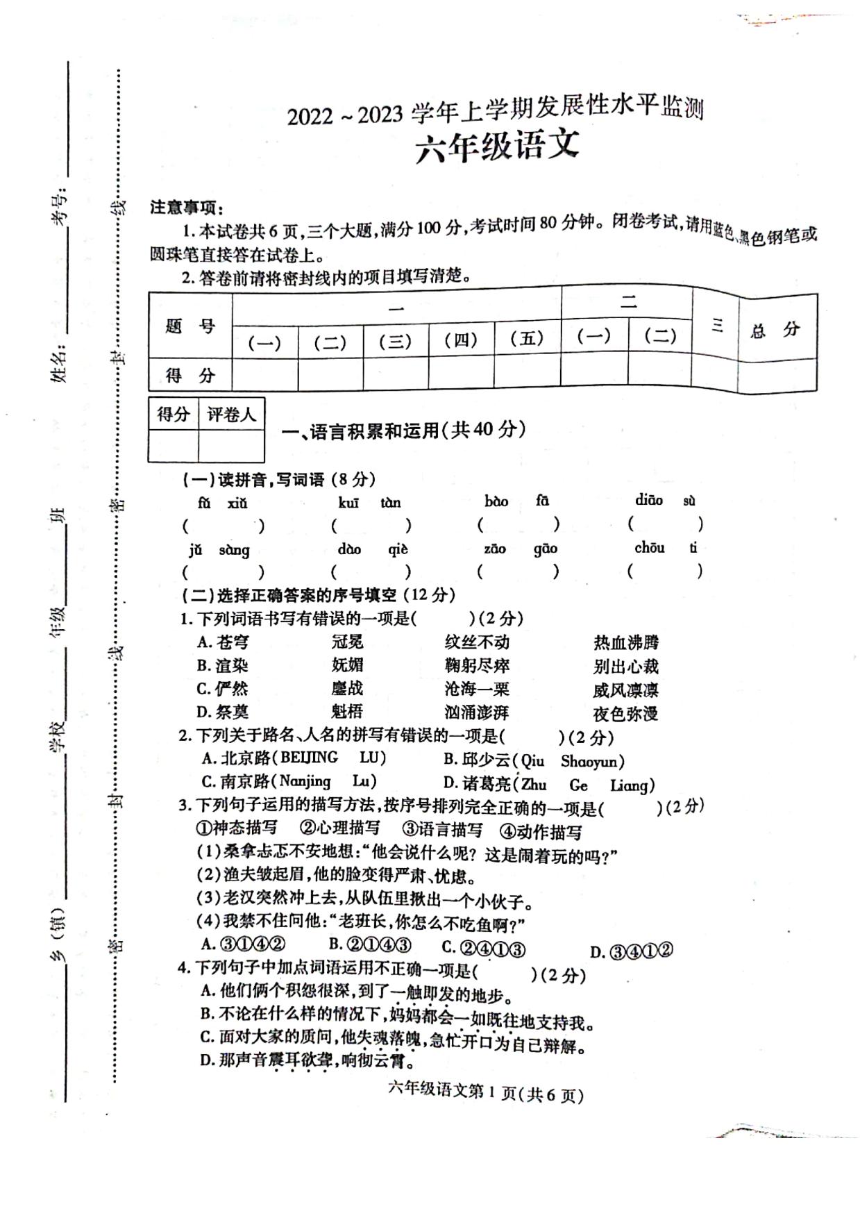 河南省漯河市舞阳县2022-2023学年六年级语文上学期第一次月考语文试题