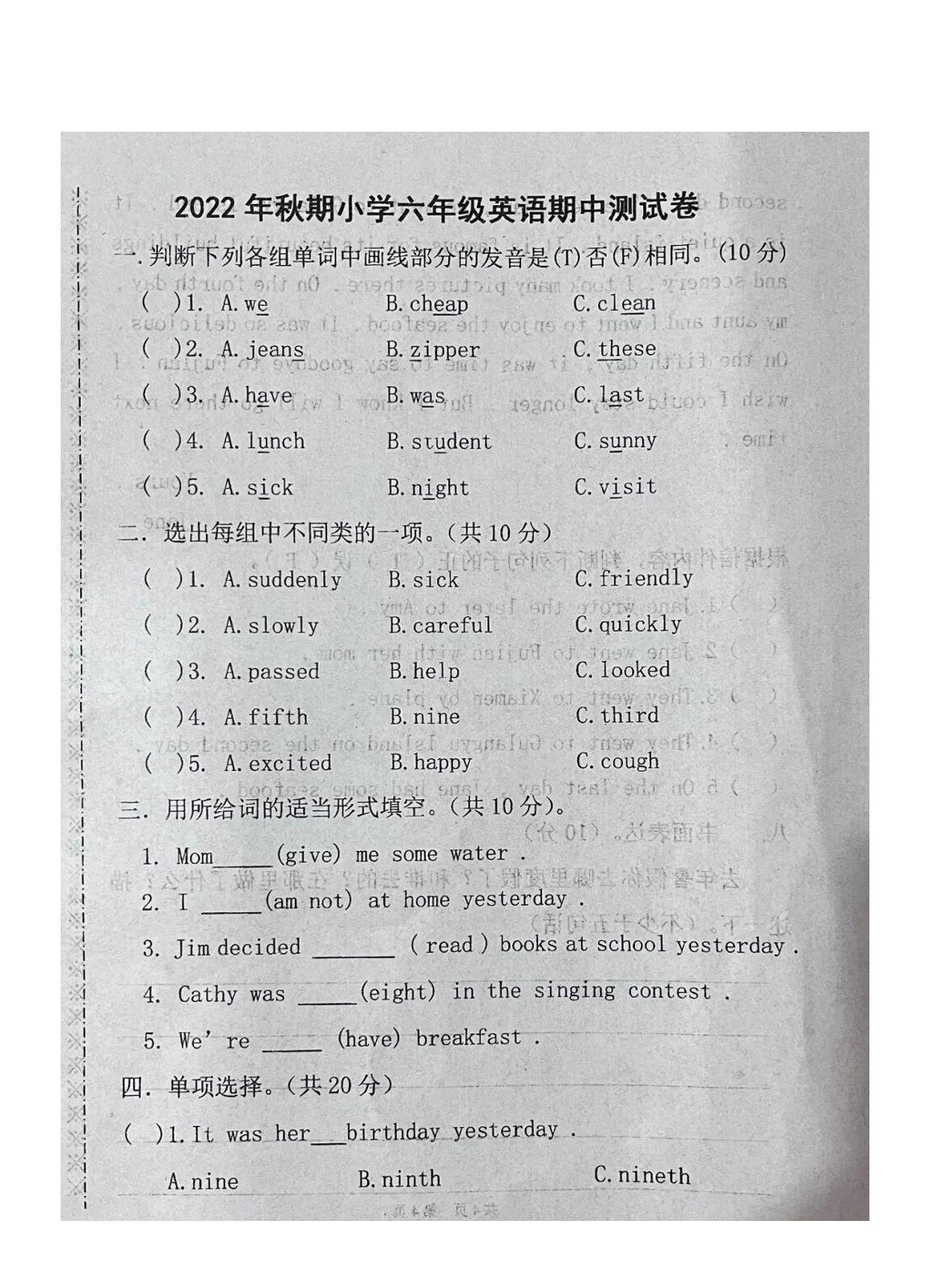 河南省南阳市卧龙区2022-2023学年上学期期中测试卷六年级英语(北师版)【无听力音频】