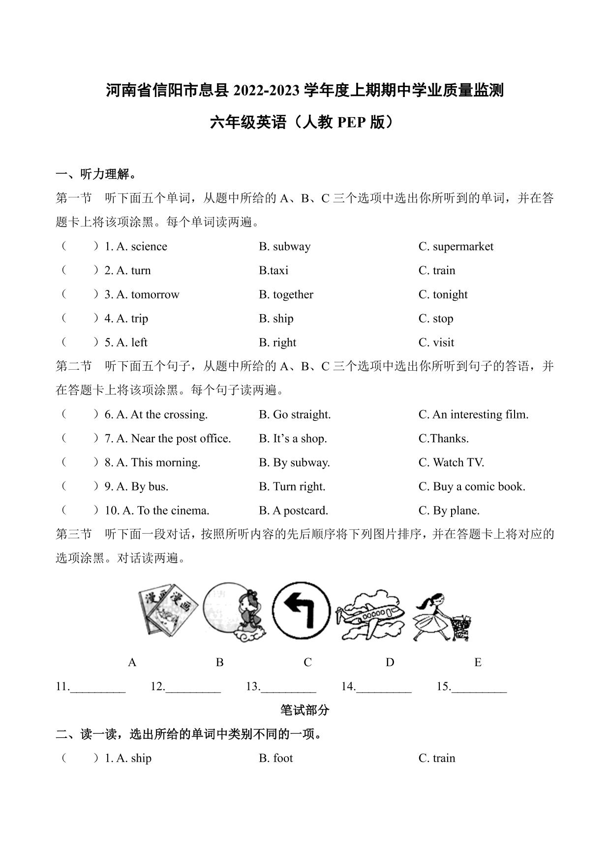 河南省信阳市息县2022-2023学年度上期期中学业质量监测六年级英语(人教PEP版)【无听力音频】