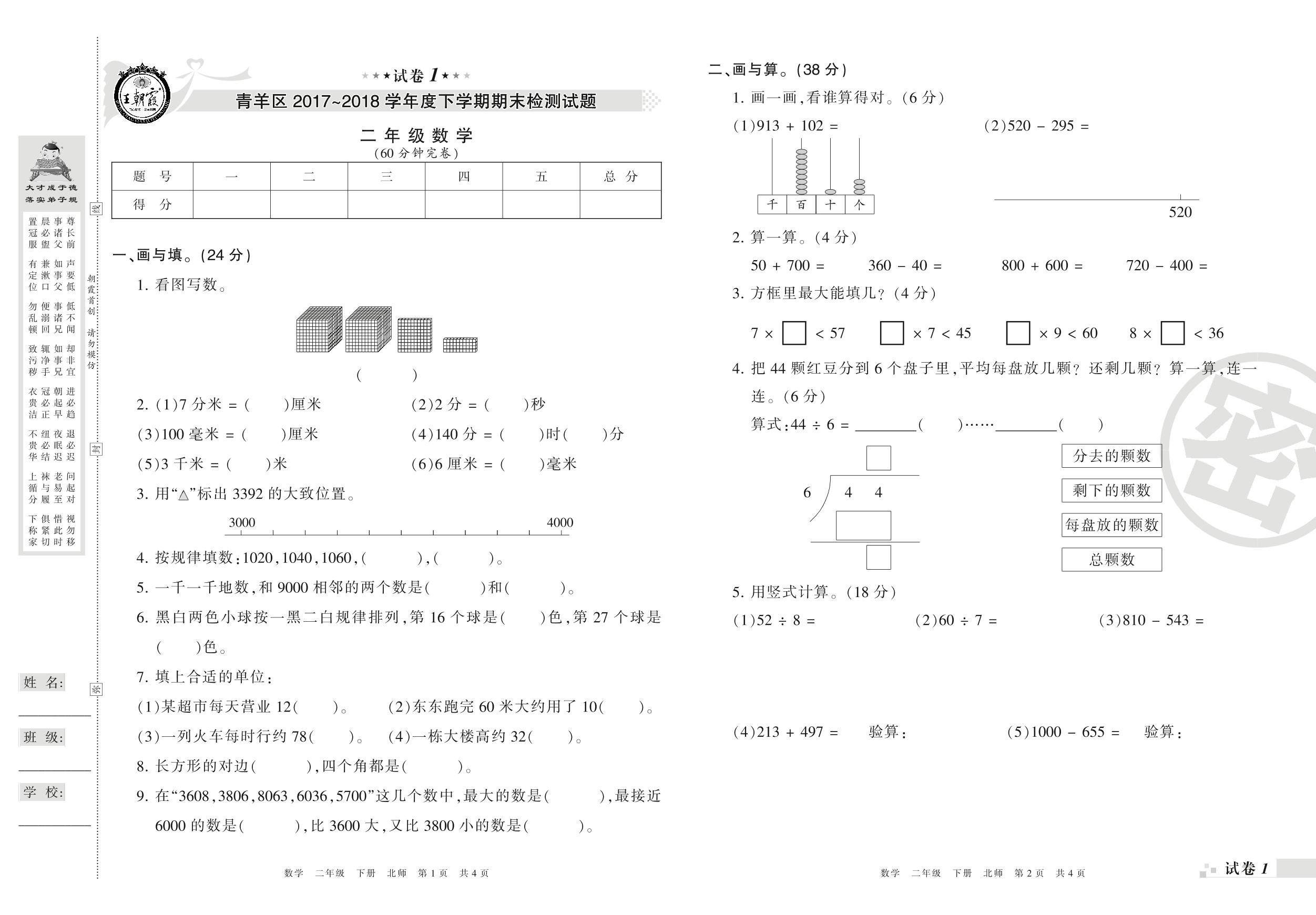 2017-2018学年第二学期成都市青羊区二年级数学试卷(北师版)【1】