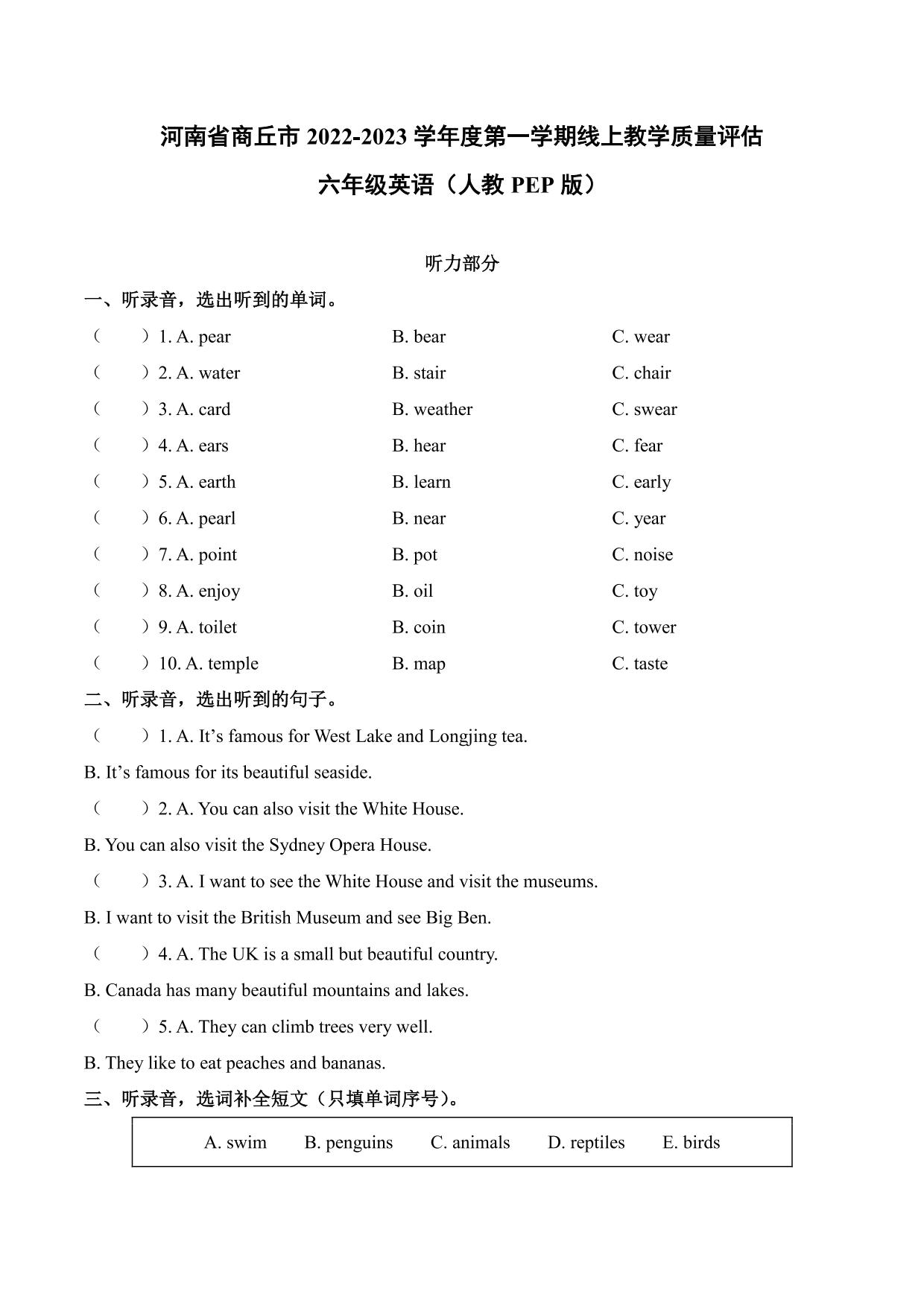 河南省商丘市2022-2023学年度第一学期线上教学质量评估六年级英语(人教PEP版)【无听力音频】