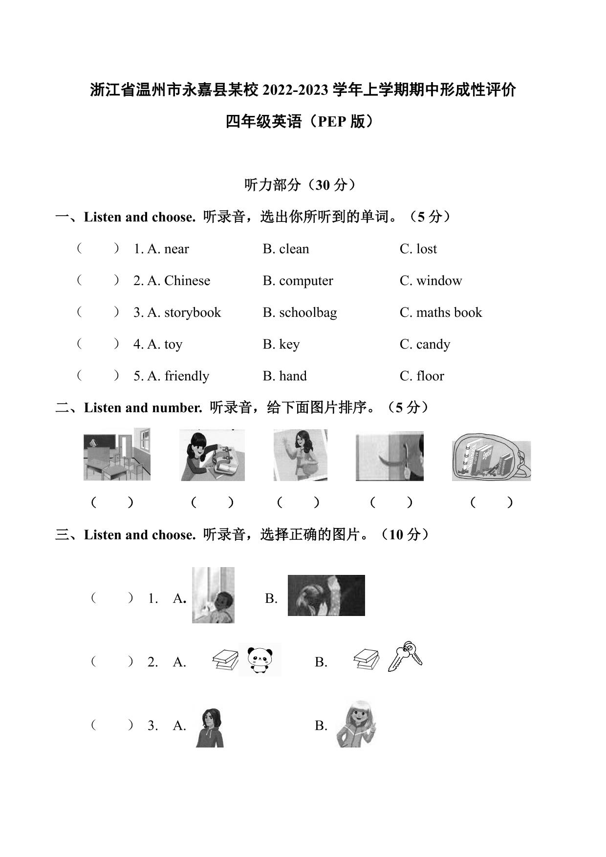 浙江省温州市永嘉县某校2022-2023学年上学期期中形成性评价四年级英语(PEP版)【无听力音频】