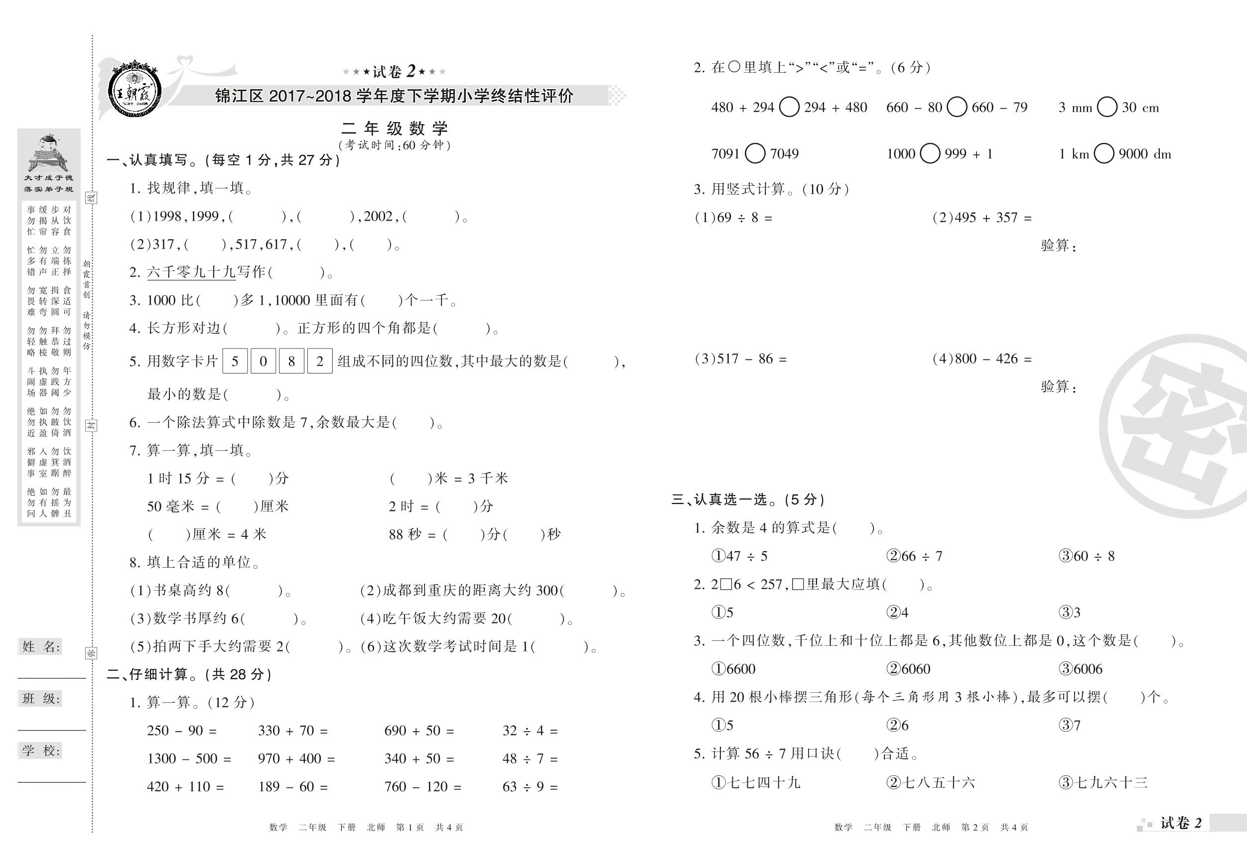 2017-2018学年第二学期成都市锦江区二年级数学试卷(北师版)【2】
