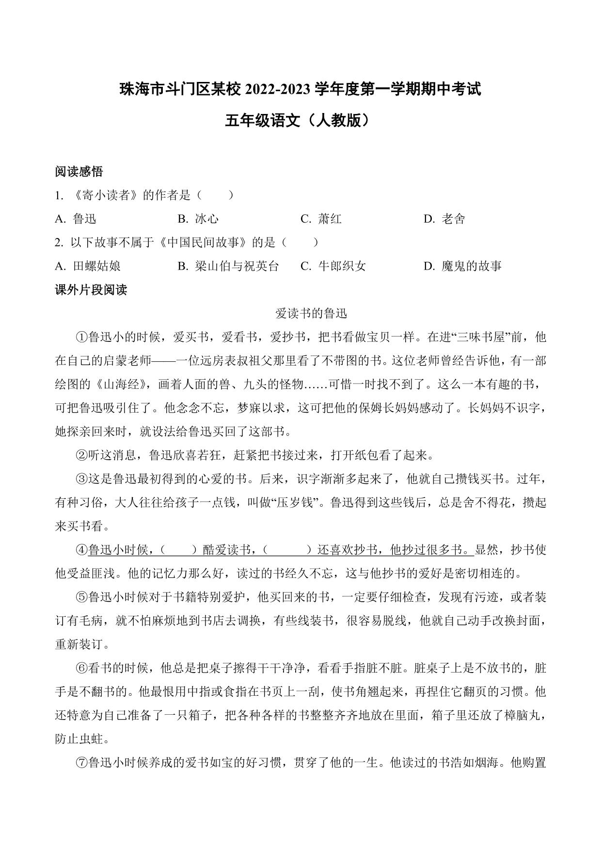 广东省珠海市斗门区某校2022-2023学年度第一学期期中考试五年级语文(人教版)