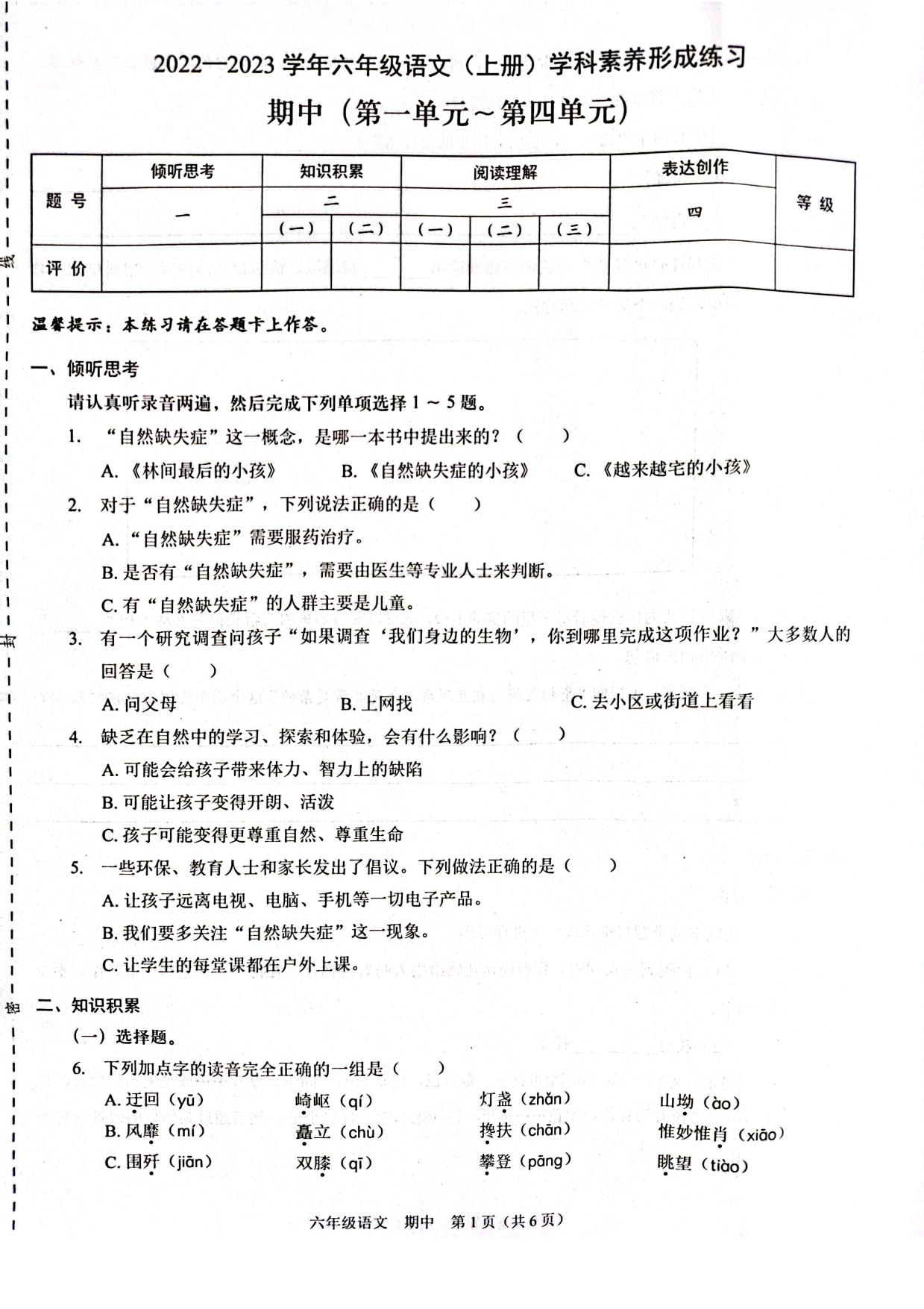 广东省深圳市龙岗区2022-2023学年(上册)期中学科素养形成练习六年级语文(人教版)