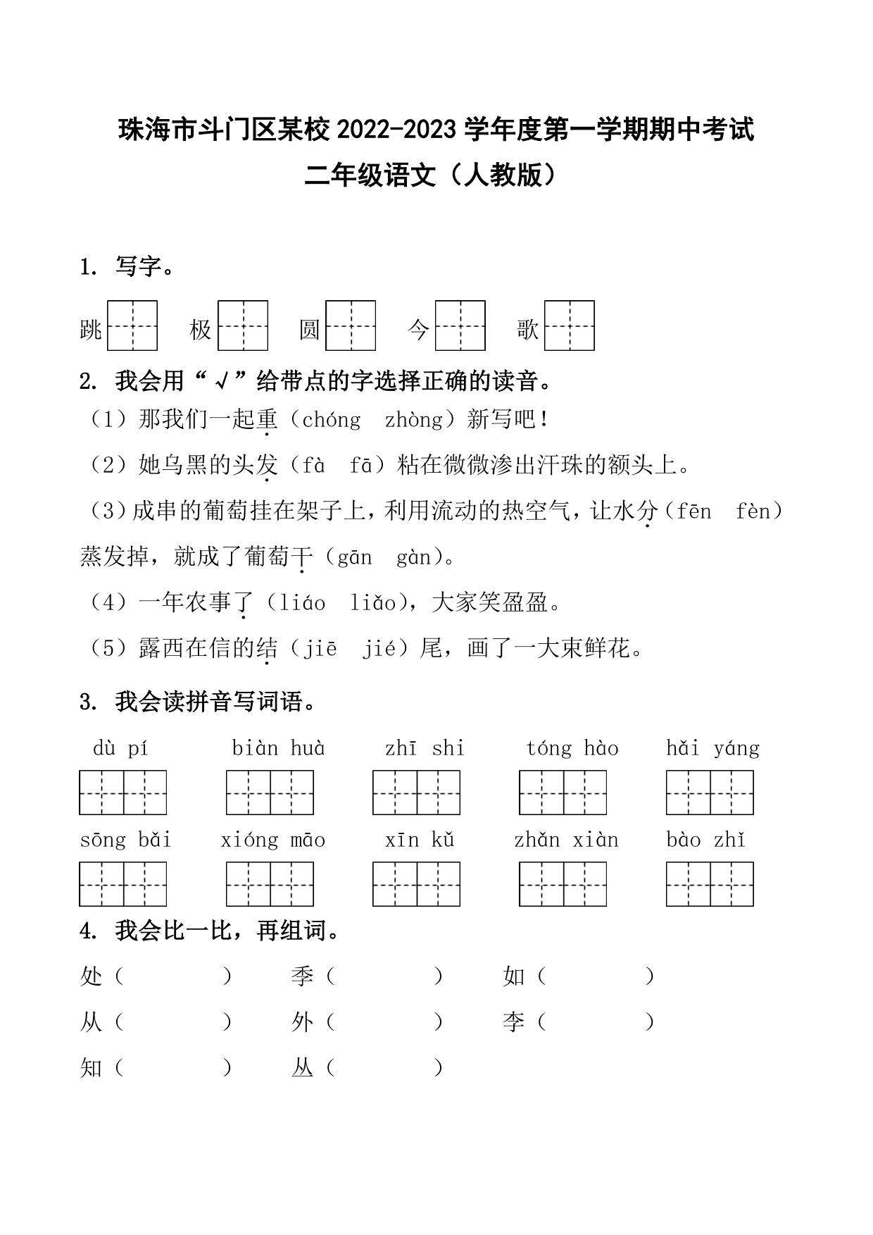 广东省珠海市斗门区某校2022-2023学年度第一学期期中考试二年级语文(人教版)