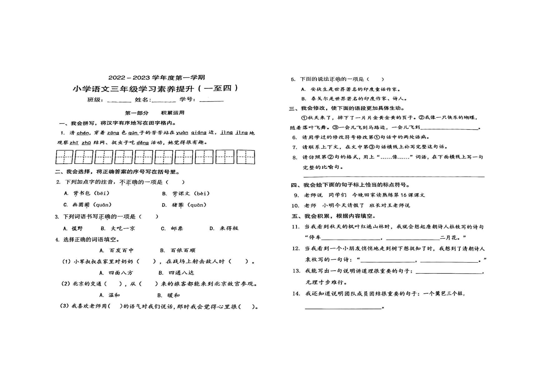 广东省深圳市龙岗区2022-2023学年(上册)期中学科素养形成练习三年级语文(人教版)正文