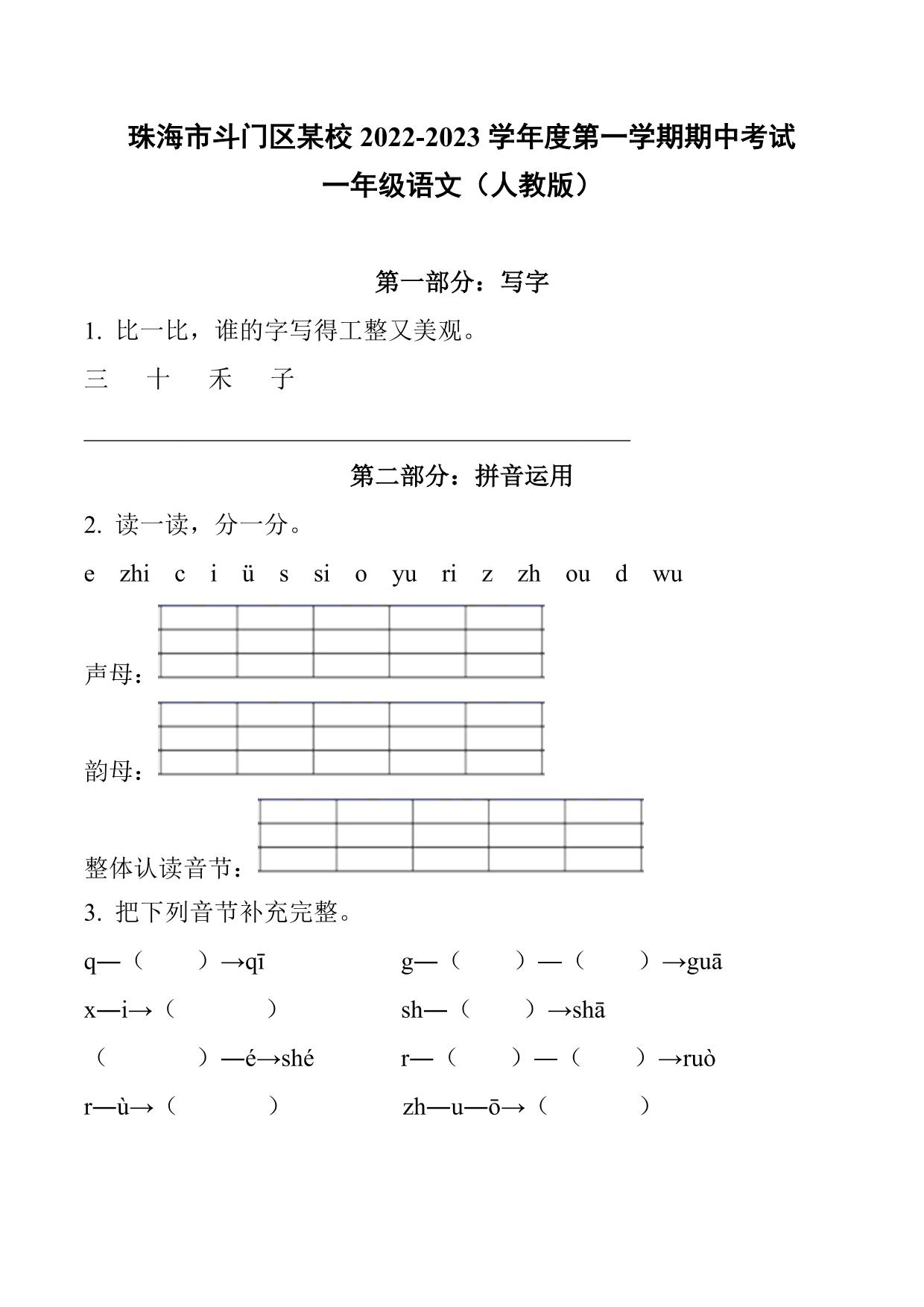 广东省珠海市斗门区某校2022-2023学年度第一学期期中考试一年级语文(人教版)
