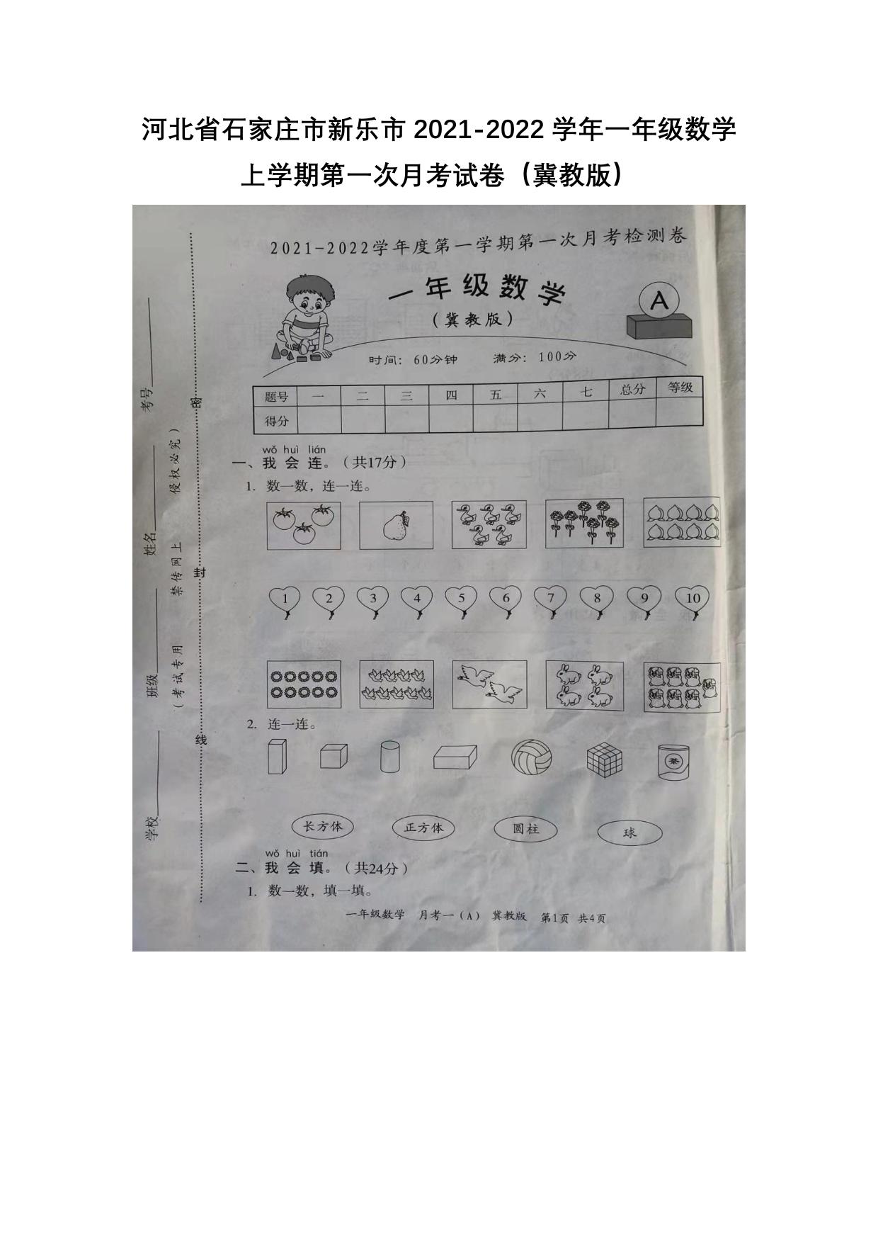 河北省石家庄市新乐市2021-2022学年一年级数学上学期第一次月考试卷(冀教版)无答案