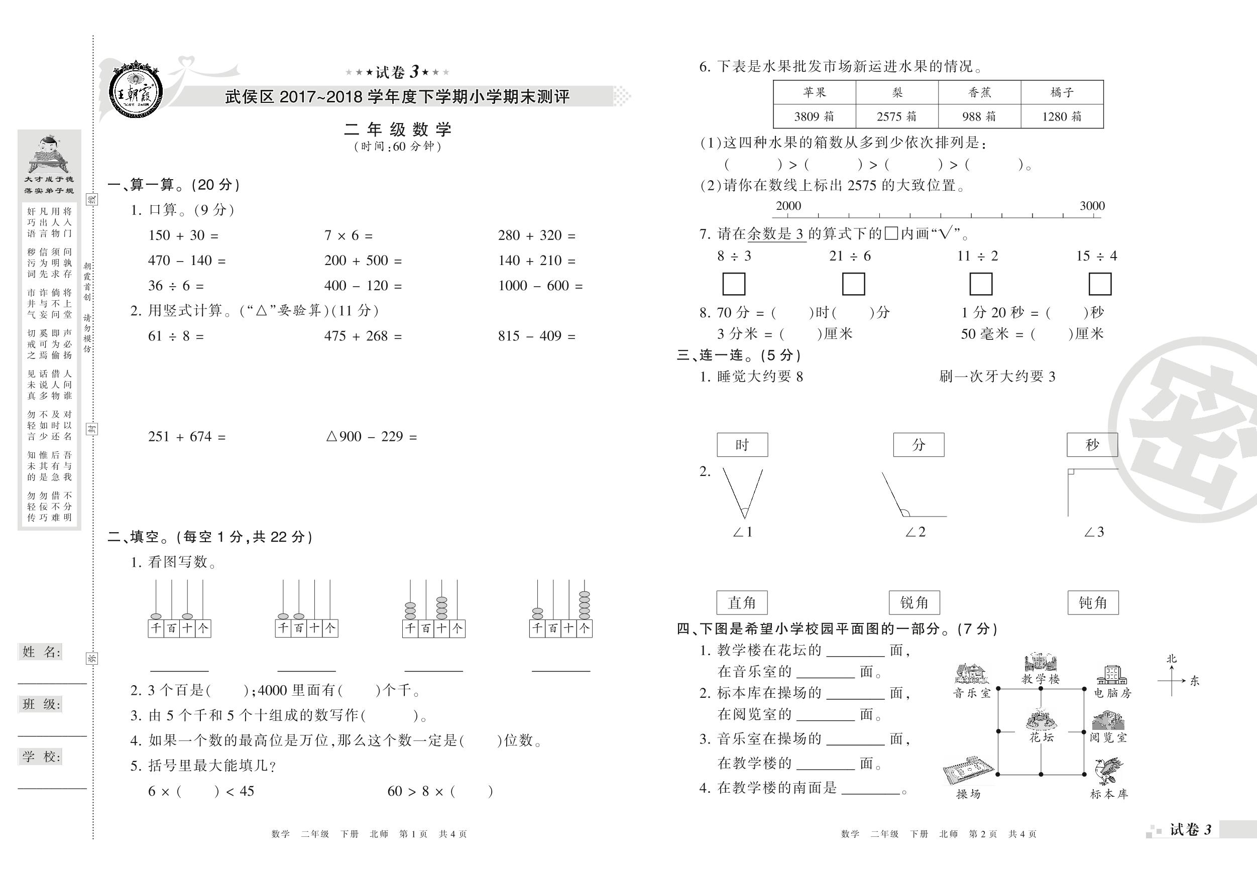 2017-2018学年第二学期成都市武侯区二年级数学试卷(北师版)【3】