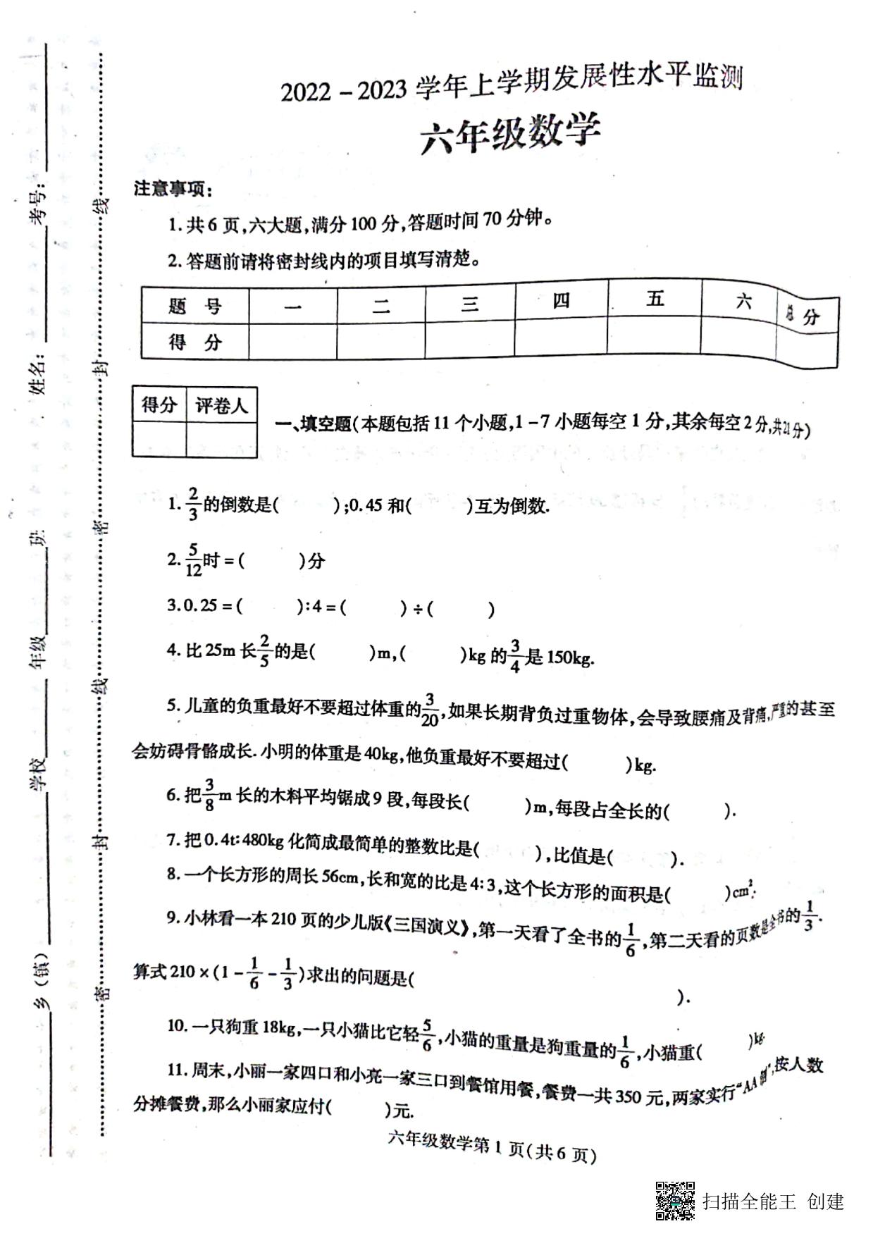 河南省漯河市舞阳县2022-2023学年六年级数学上学期第一次月考试卷(人教版)