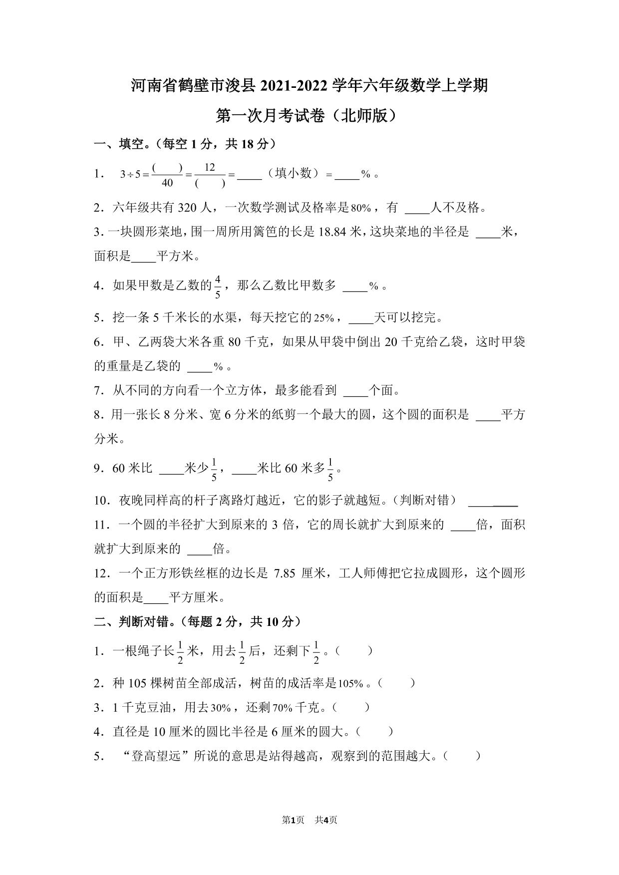 河南省鹤壁市浚县2021-2022学年六年级数学上学期第一次月考试卷(北师版)