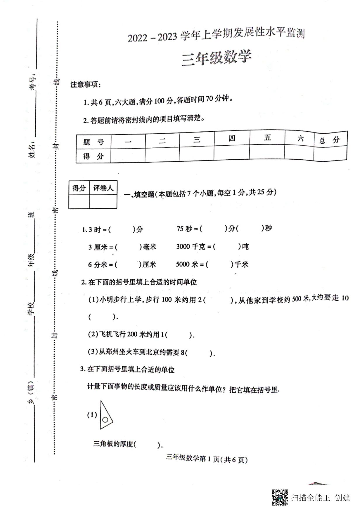 三年级数学人教版上册月考卷