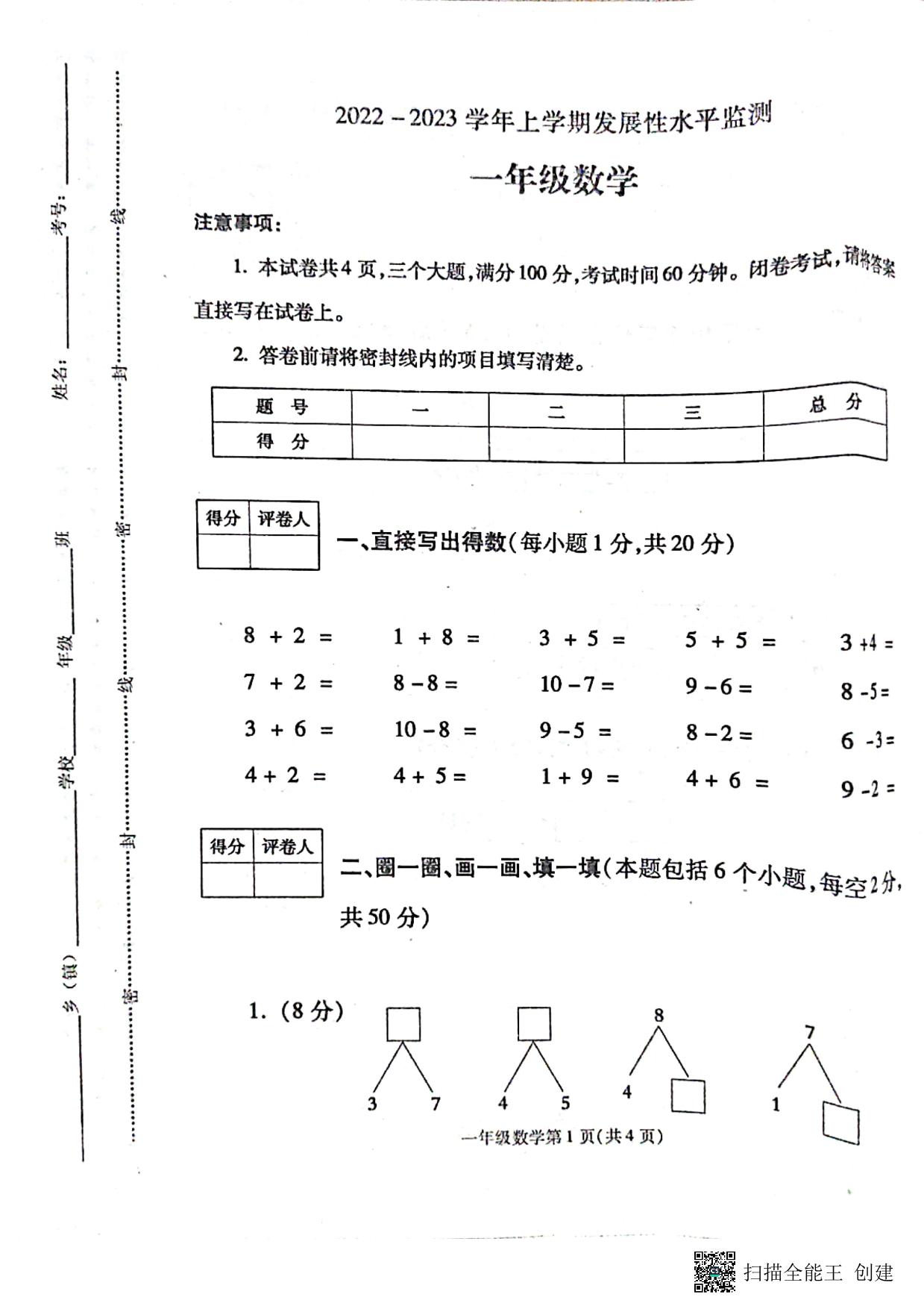 一年级数学人教版上册月考卷