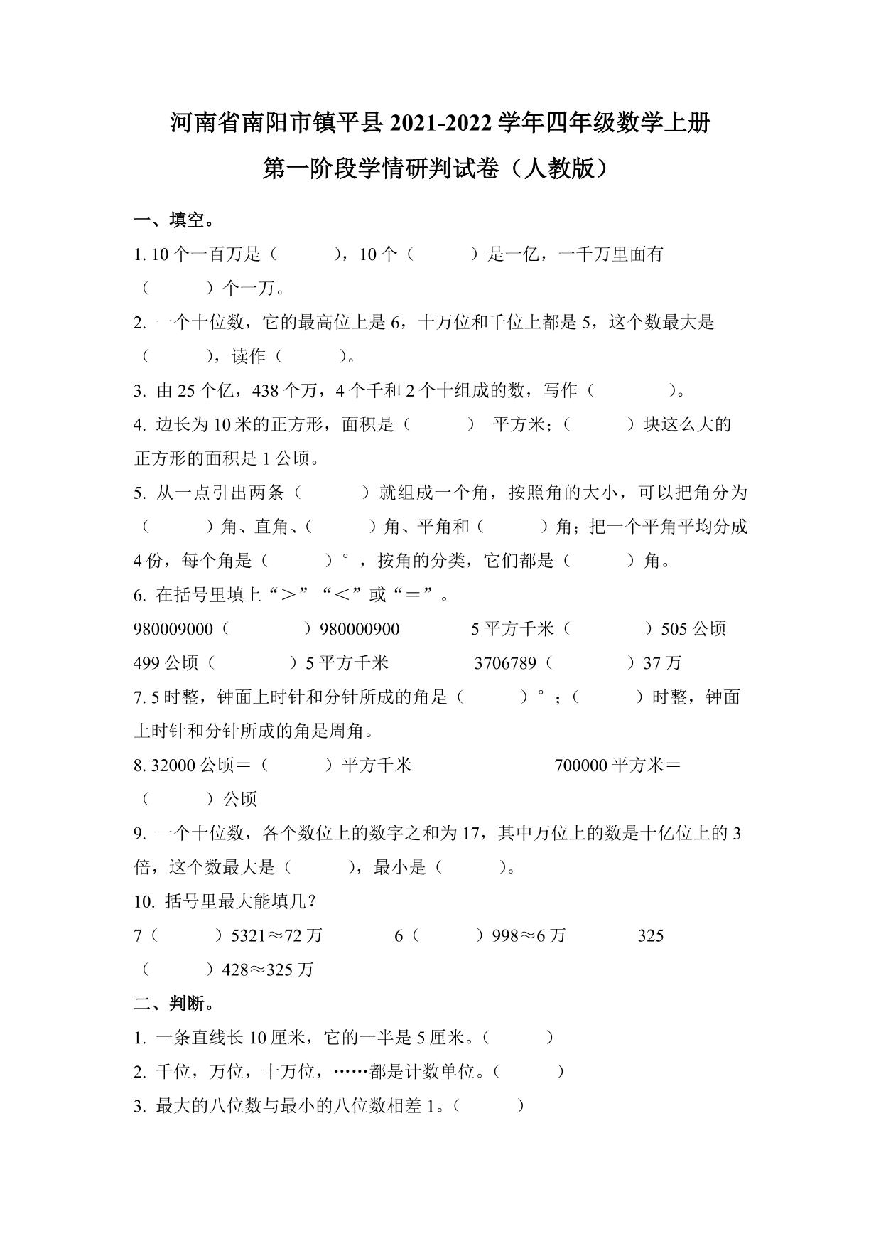 河南省南阳市镇平县2021-2022学年四年级数学上册第一阶段学情研判试卷(人教版)