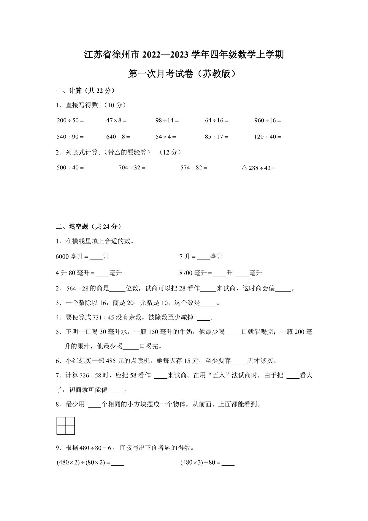 江苏省徐州市2022—2023学年四年级数学上学期第一次月考试卷(苏教版)