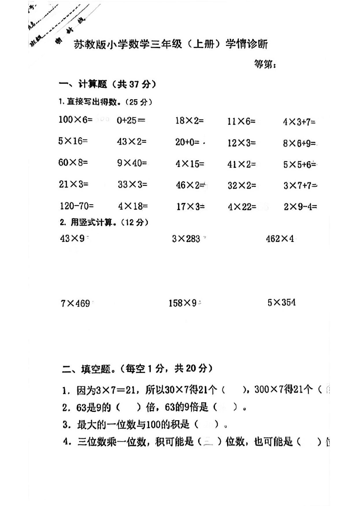 江苏省徐州市经济开发区2022-2023学年三年级数学上学期第一次月考试卷(苏教板)