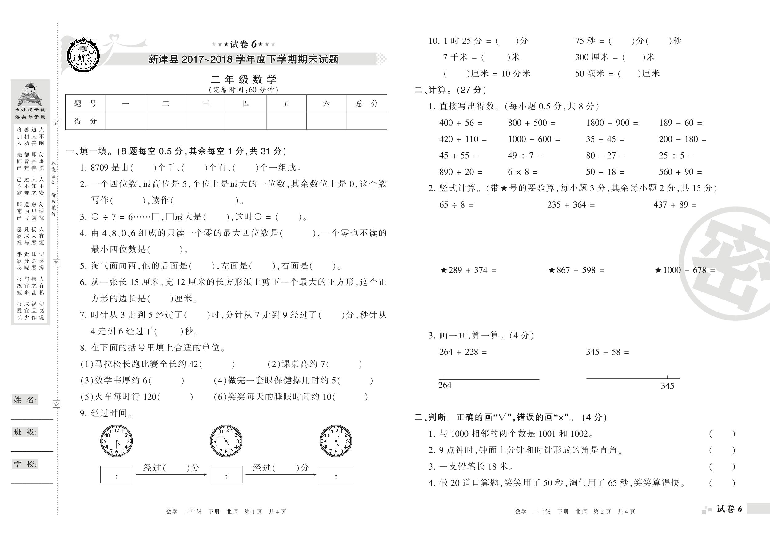 2017-2018学年第二学期成都市新津县二年级数学试卷(北师版)【6】