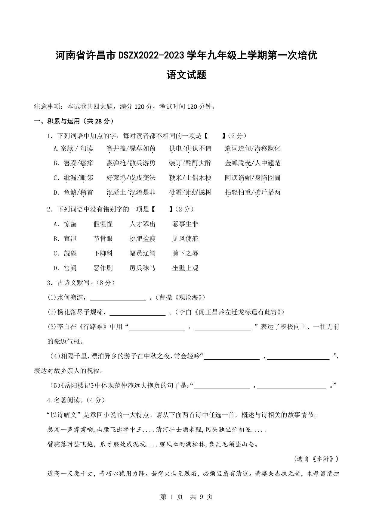 河南省许昌市DSZX2022-2023学年九年级上学期第一次培优语文试题