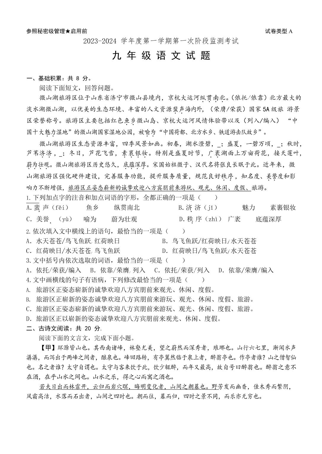 山东省曲阜市XTZX2023—2024学年第一学期第一次阶段监测考试九年级语文试题