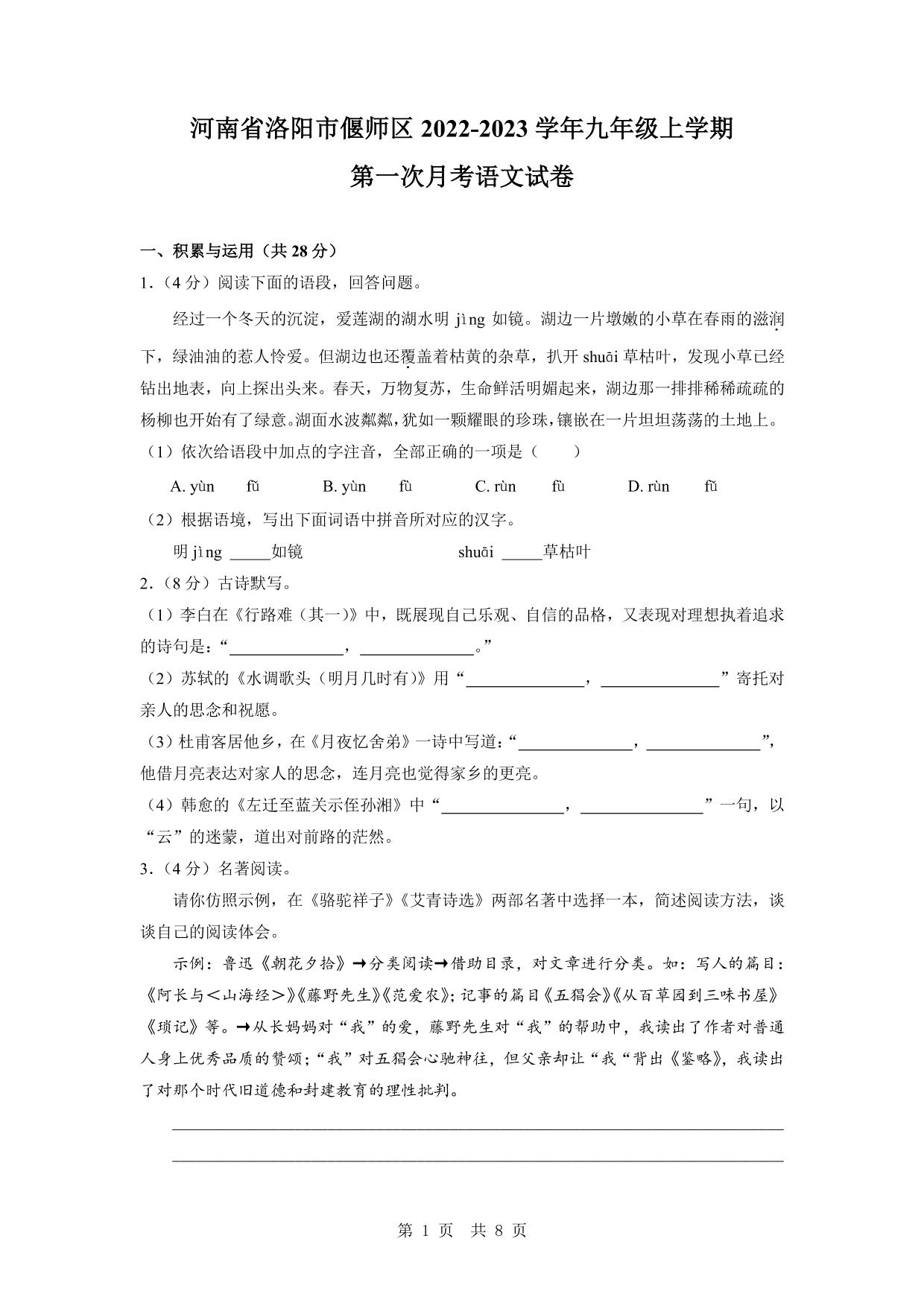 河南省洛阳市偃师区2022-2023学年九年级上学期第一次月考语文试卷