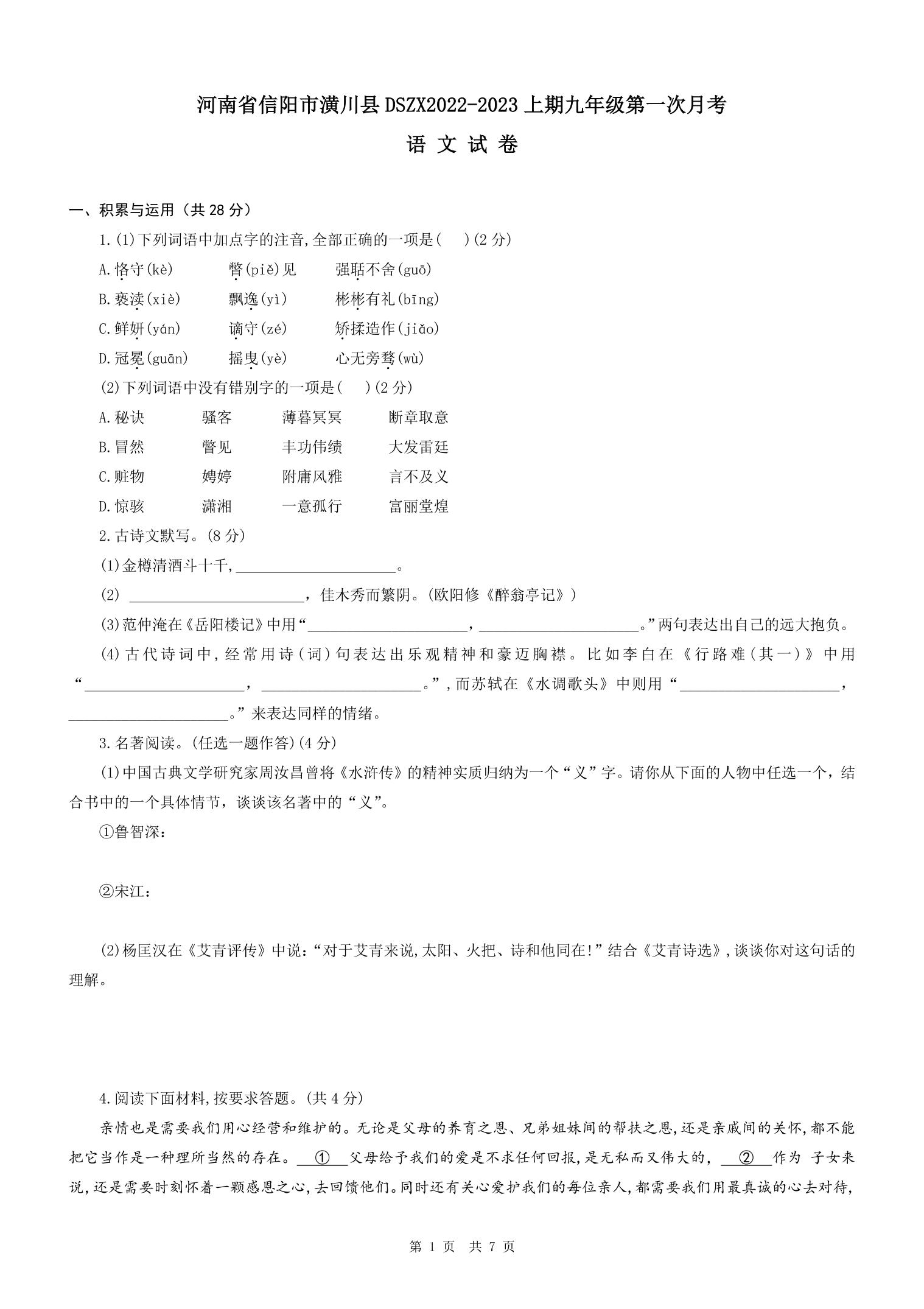 河南省信阳市潢川县DSZX2022-2023学年九年级上学期第一次月考语文试题