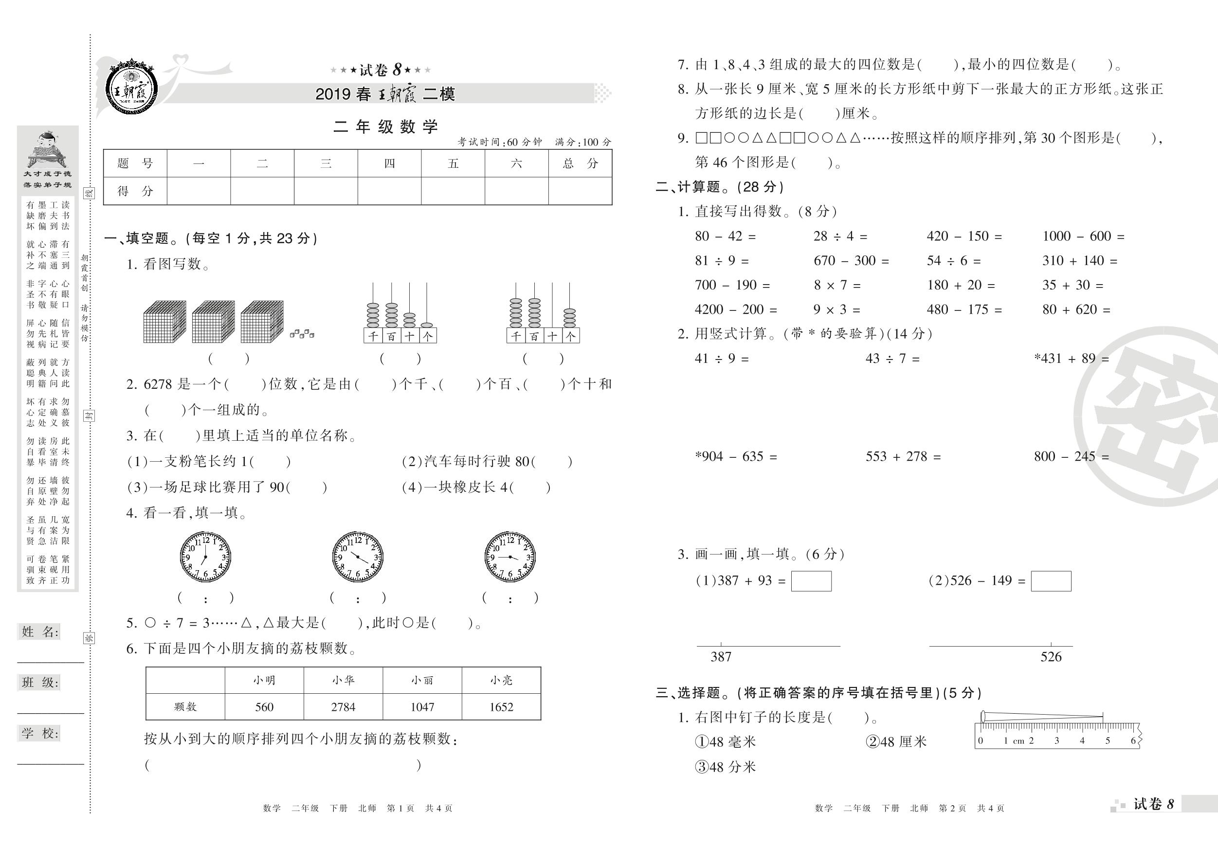 王朝霞期末模拟卷二年级下册数学(北师版)_R210803100000【8】