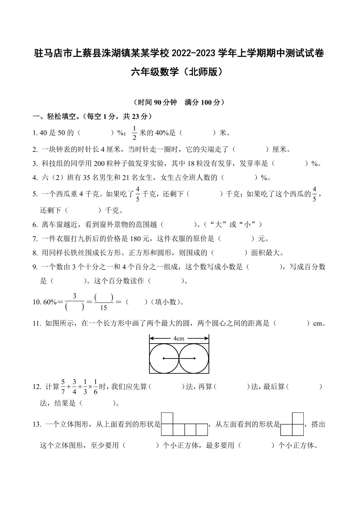 河南省驻马店市上蔡县洙湖镇某某学校2022-2023学年上学期期中测试试卷六年级数学(北师版)
