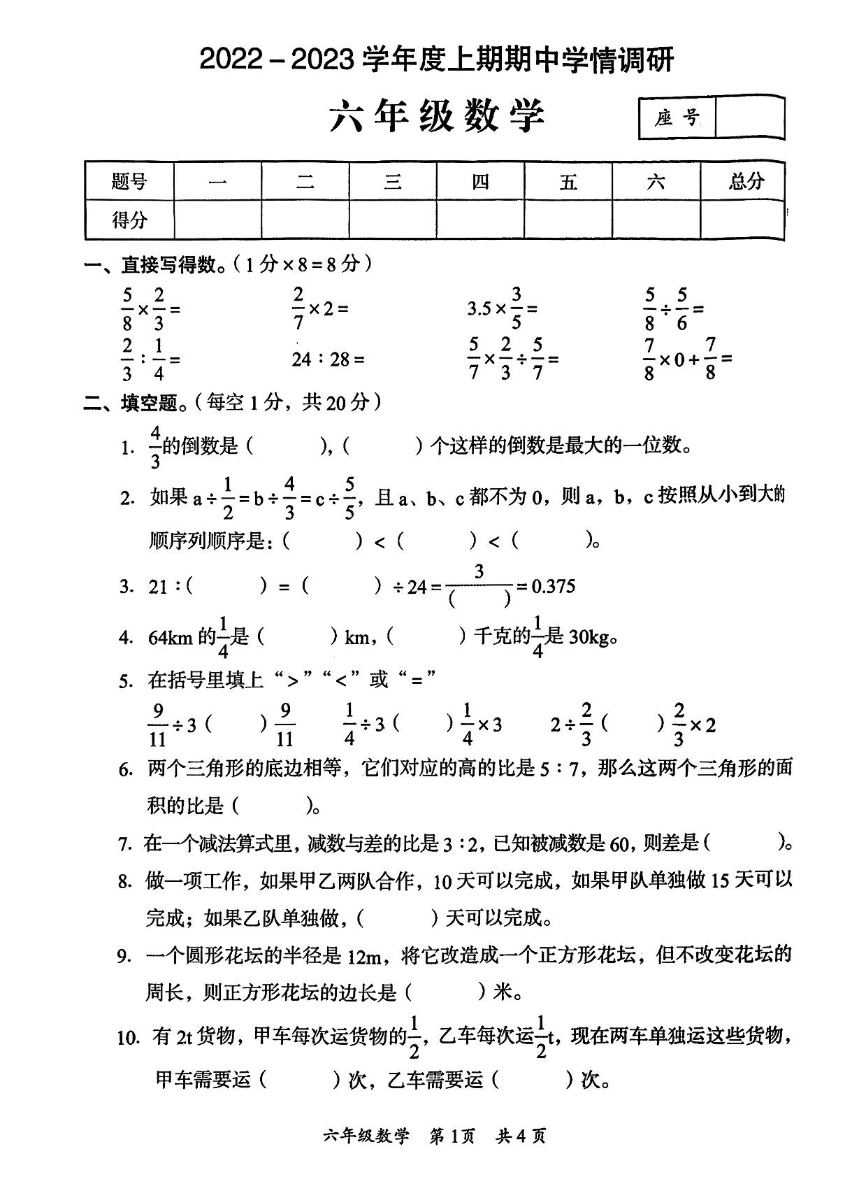 河南省驻马店市西平县2022-2023学年度上学期期中学情调研试题六年级数学(人教版)