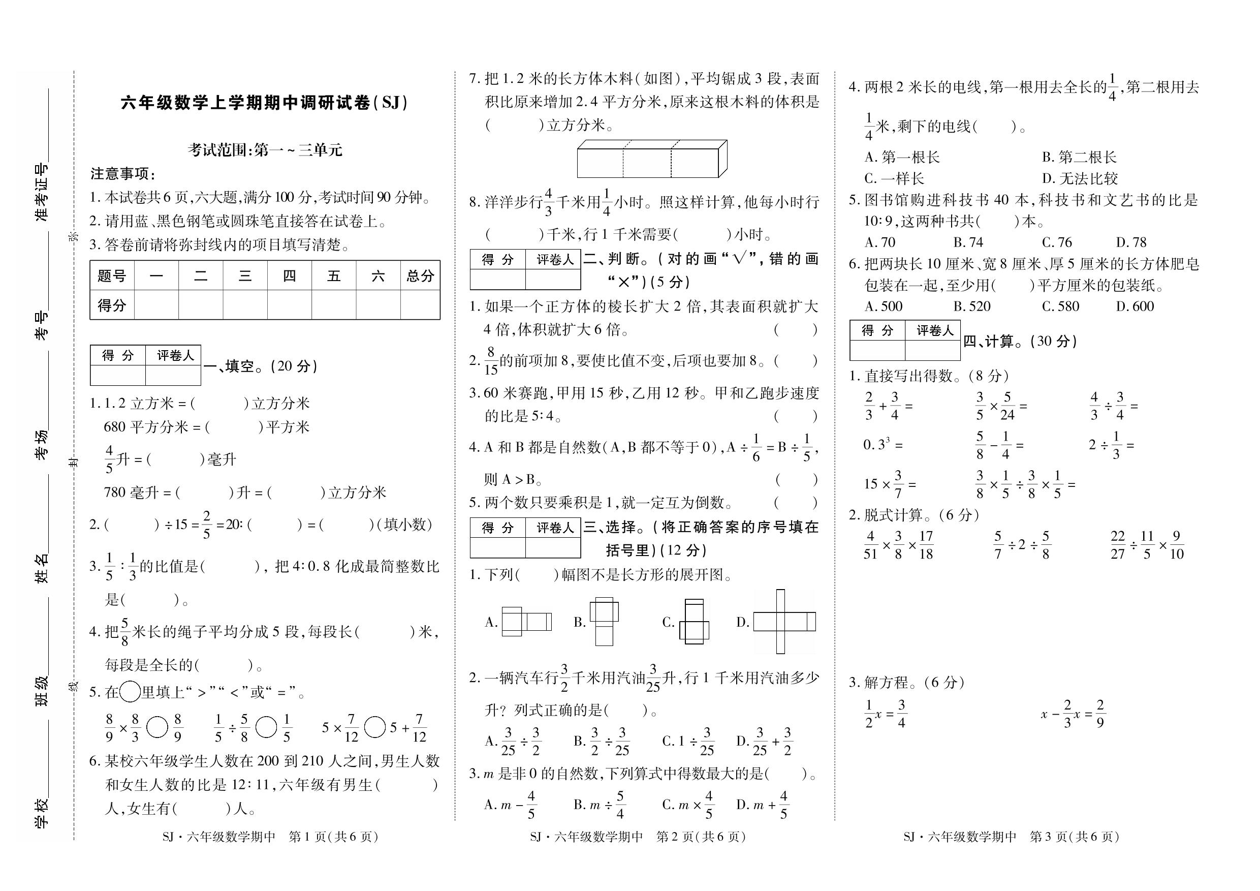 河南省洛阳市偃师区某学校2022-2023学年上学期期中调研试卷六年级数学(苏教版)