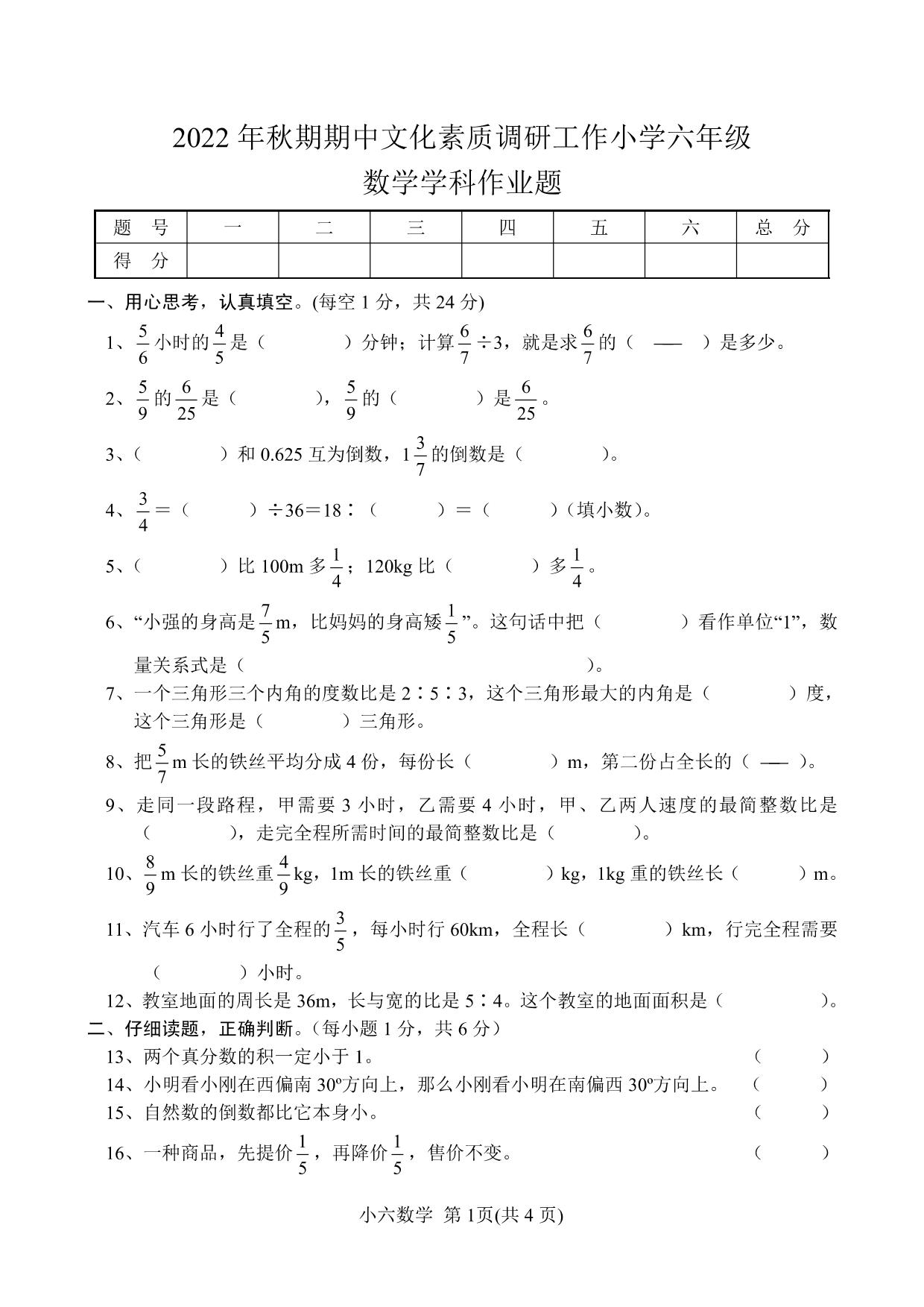 河南省南阳市方城县2022-2023学年上学期期中文化素质调研工作学科作业题六年级数学(人教版)