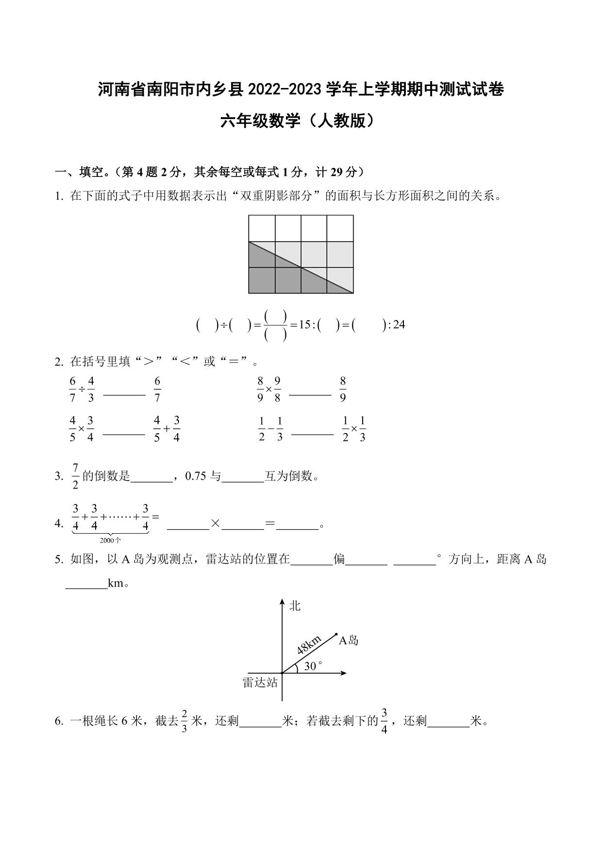 河南省南阳市内乡县2022-2023学年上学期期中测试试卷六年级数学(人教版)