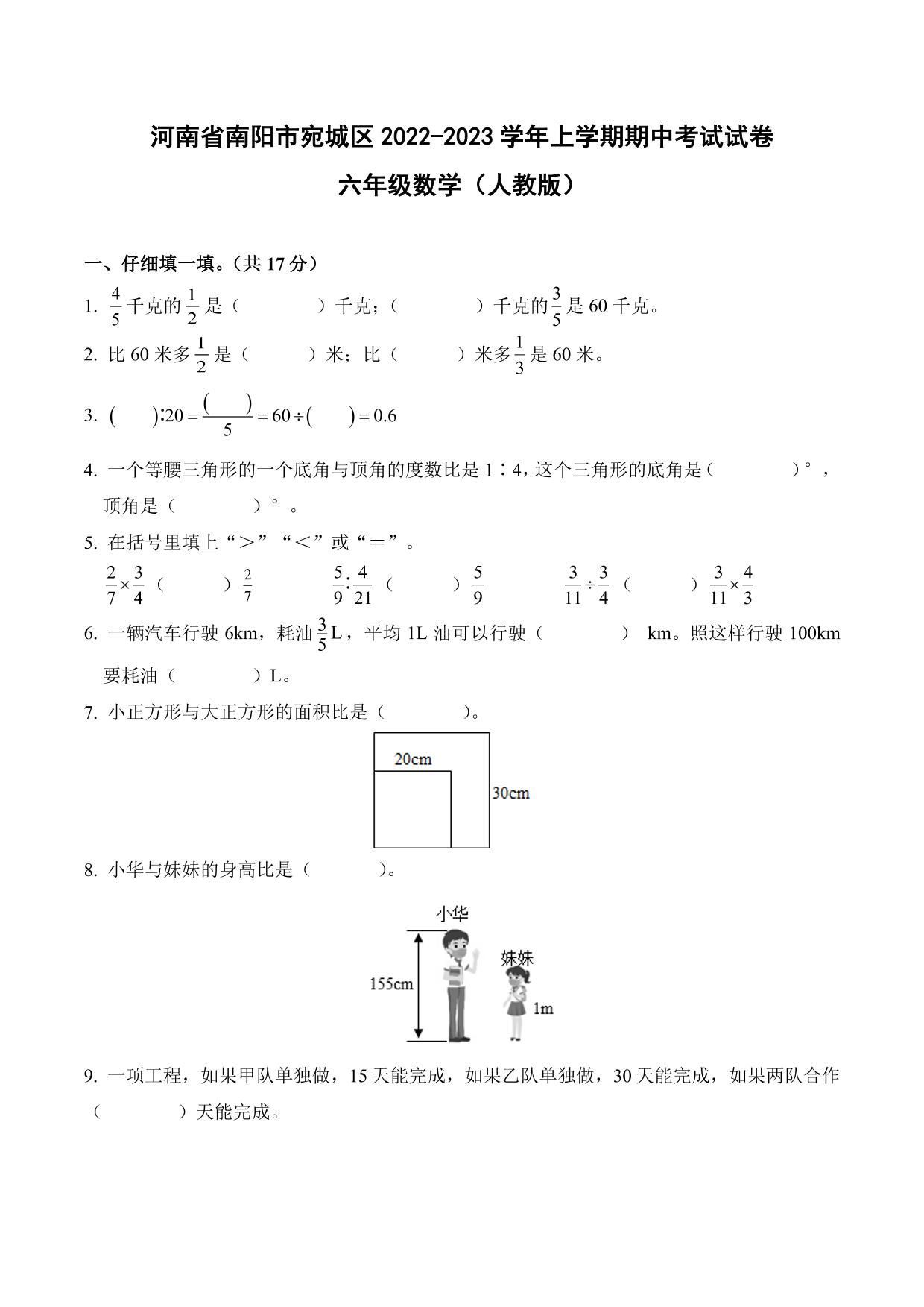河南省南阳市宛城区2022-2023学年上学期期中考试试卷六年级数学(人教版)
