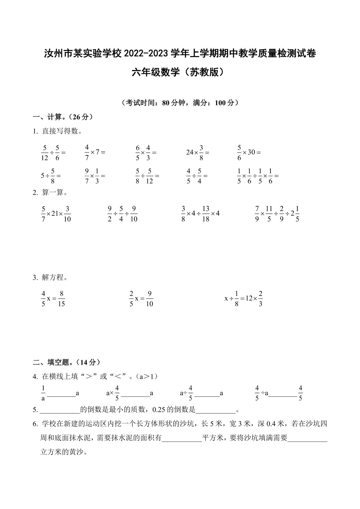 河南省平顶山市汝州市某实验学校2022-2023学年上学期期中教学质量检测试卷六年级数学(苏教版)