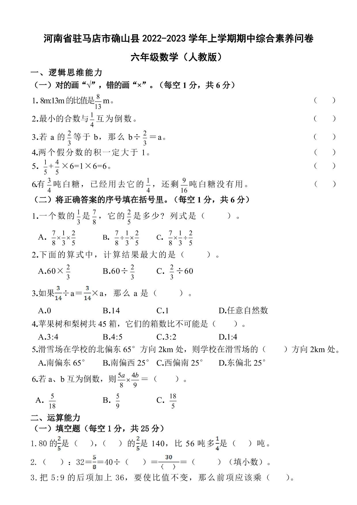 河南省驻马店市确山县2022-2023学年上学期期中综合素养问卷六年级数学(人教版)