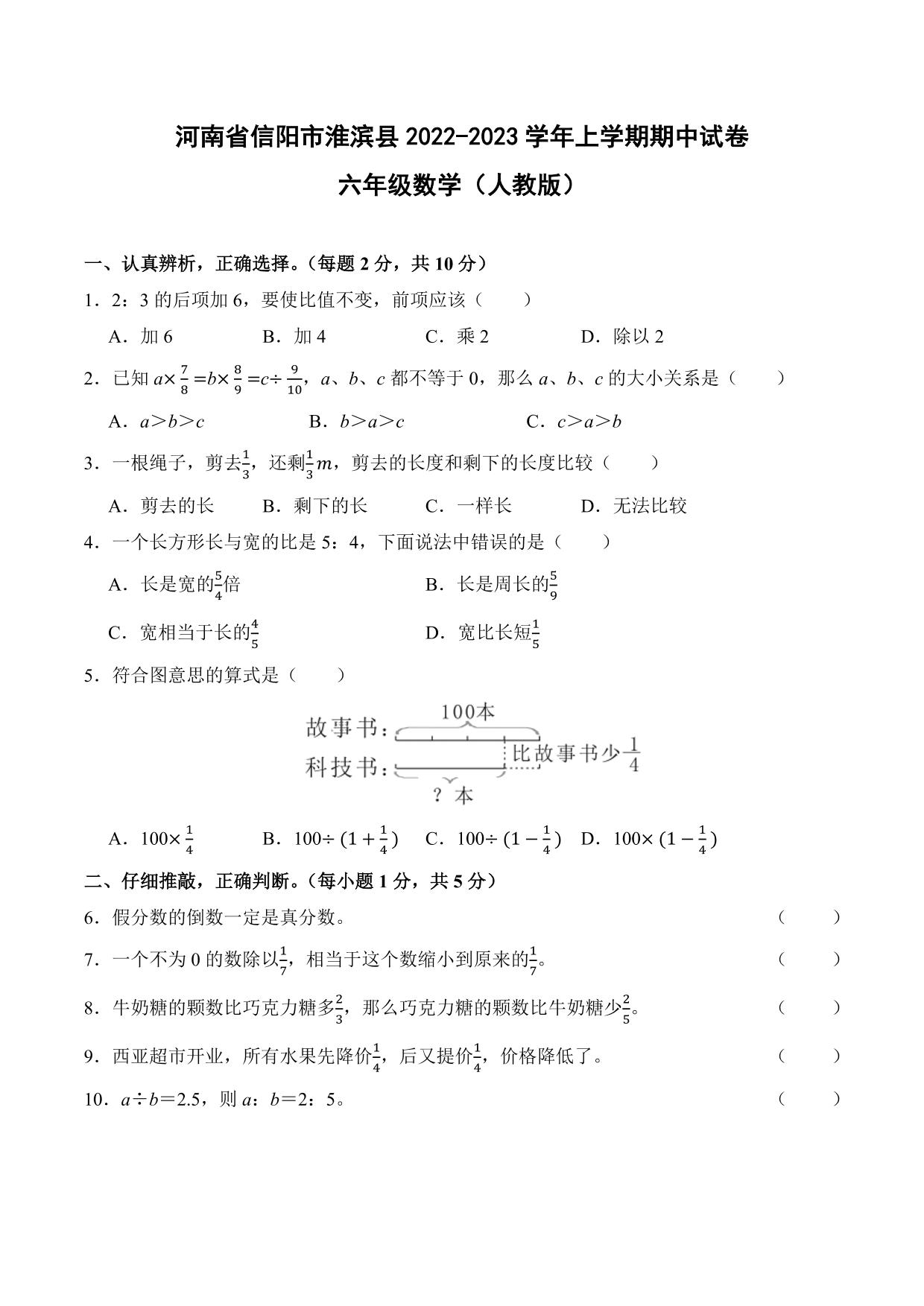 河南省信阳市淮滨县2022-2023学年上学期期中试卷六年级数学(人教版)
