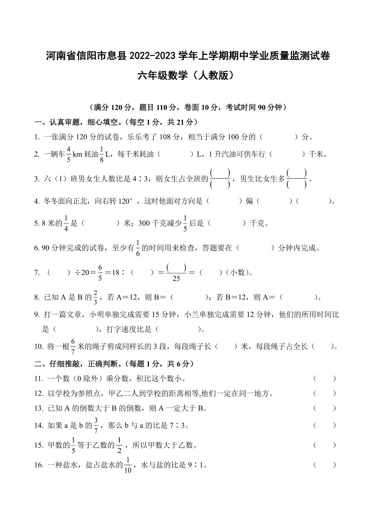 河南省信阳市息县2022-2023学年上学期期中学业质量监测试卷六年级数学(人教版)