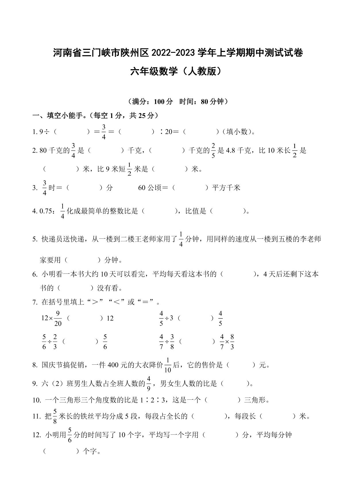 河南省三门峡市陕州区2022-2023学年上学期期中测试试卷六年级数学(人教版)