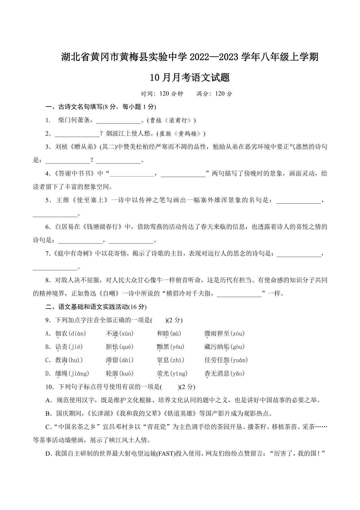 湖北省黄冈市黄梅县实验中学2022—2023学年八年级上学期十月月考语文试题